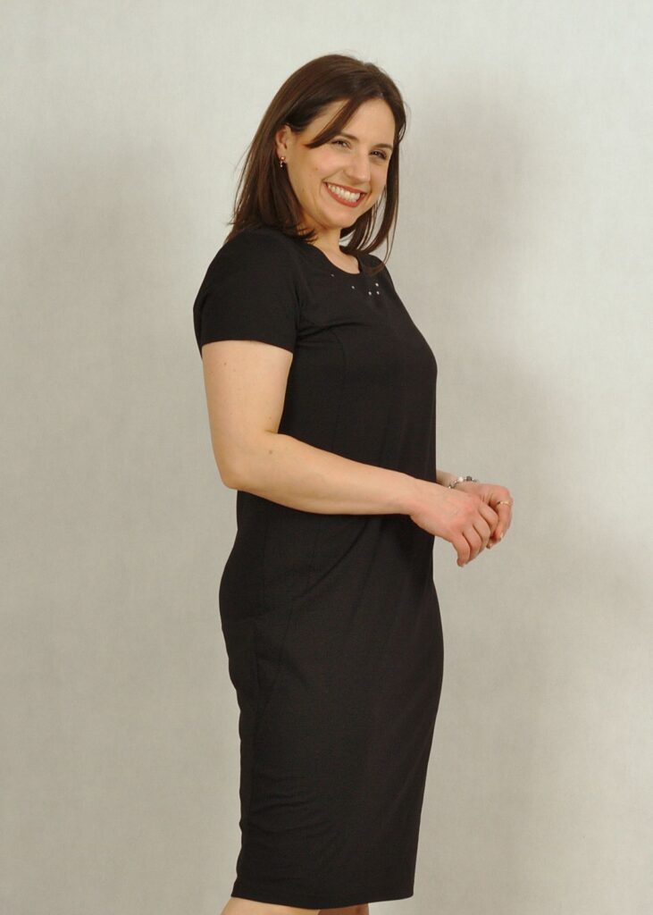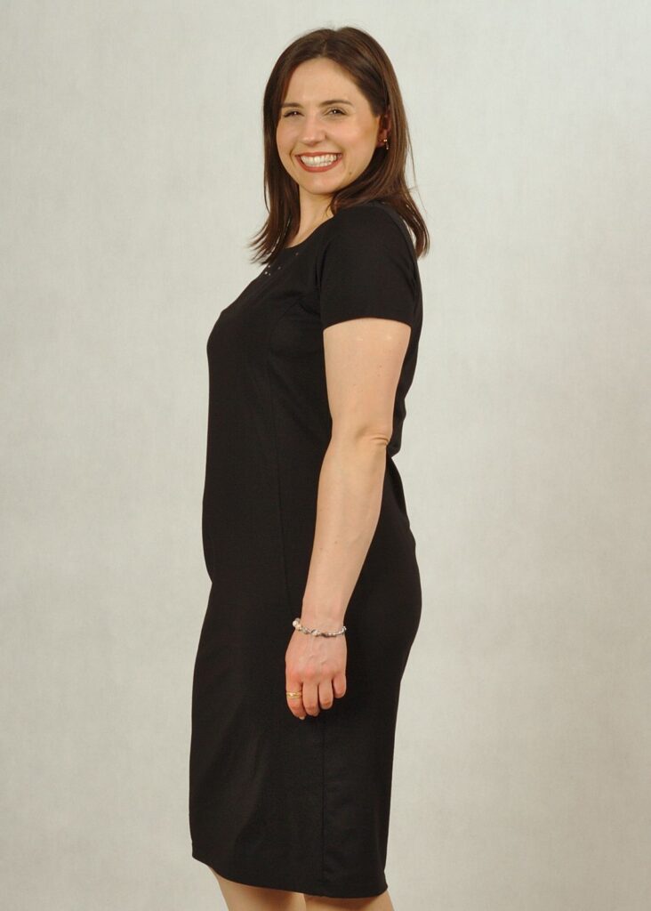 Bardzo klasyczna, prosta sukienka z delikatnymi zdobieniami przy dekolcie to istna “mała czarna” na każdą okazję.