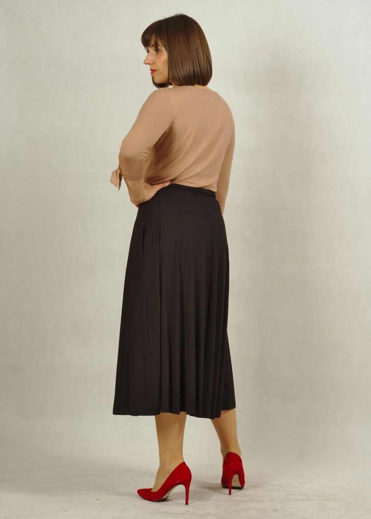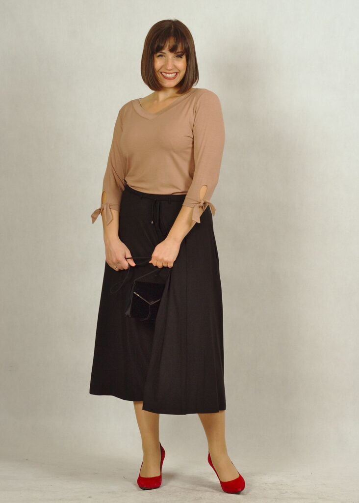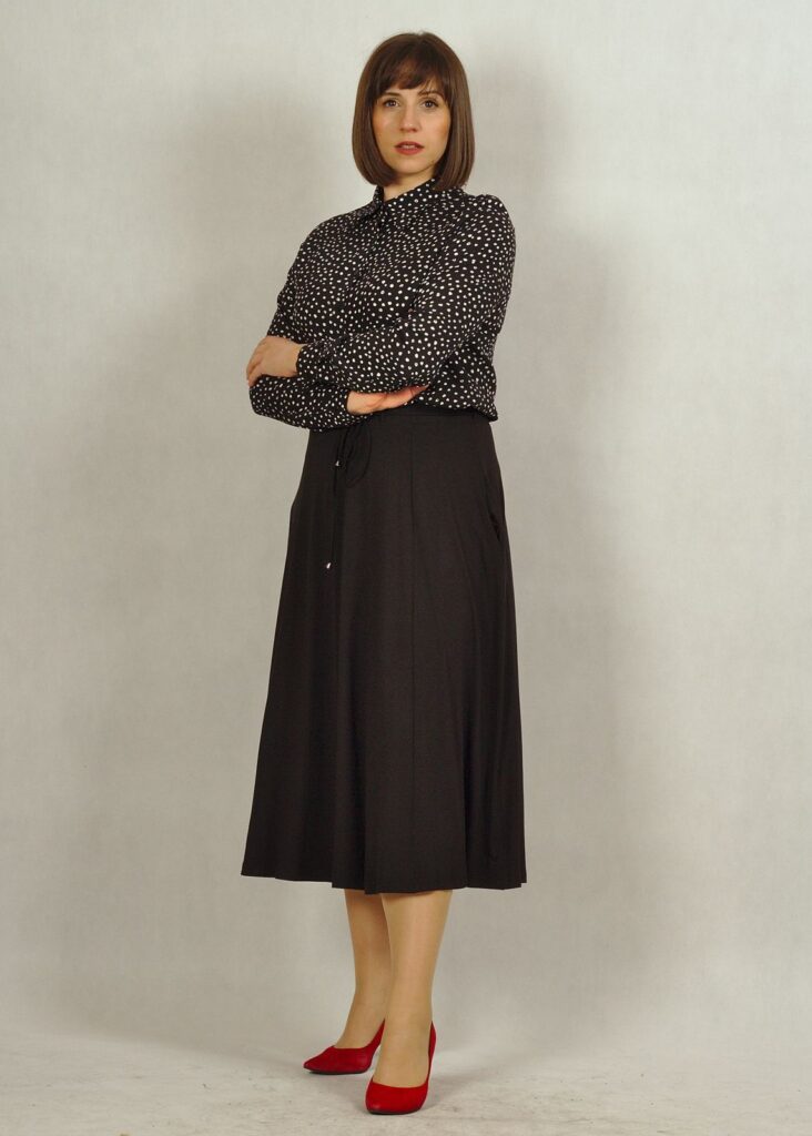 Spódnica midi, to długość bardzo modna i wygodna, do połowy łydki. Dopasujesz do niej trampki, buty na obcasie lub letnie sandałki.