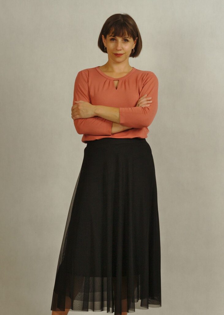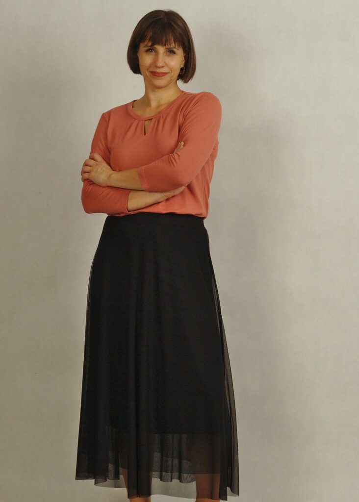 Do takiej spódnicy możesz dodać trampki, szpilki lub kozaki, w zależności od pomysłu na całość stylizacji.