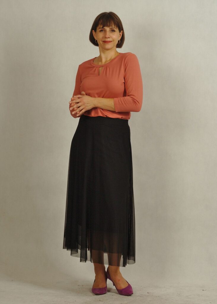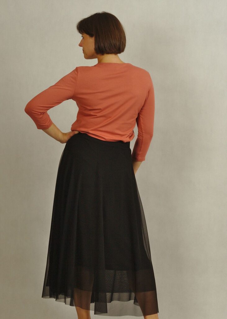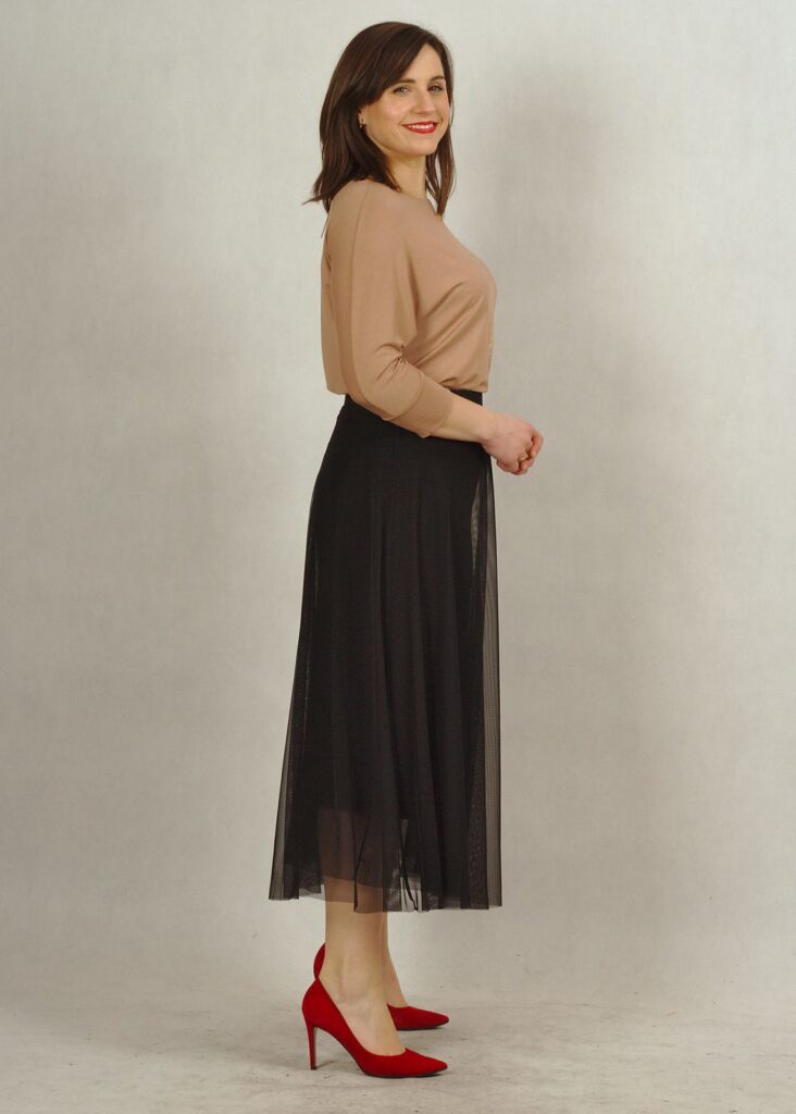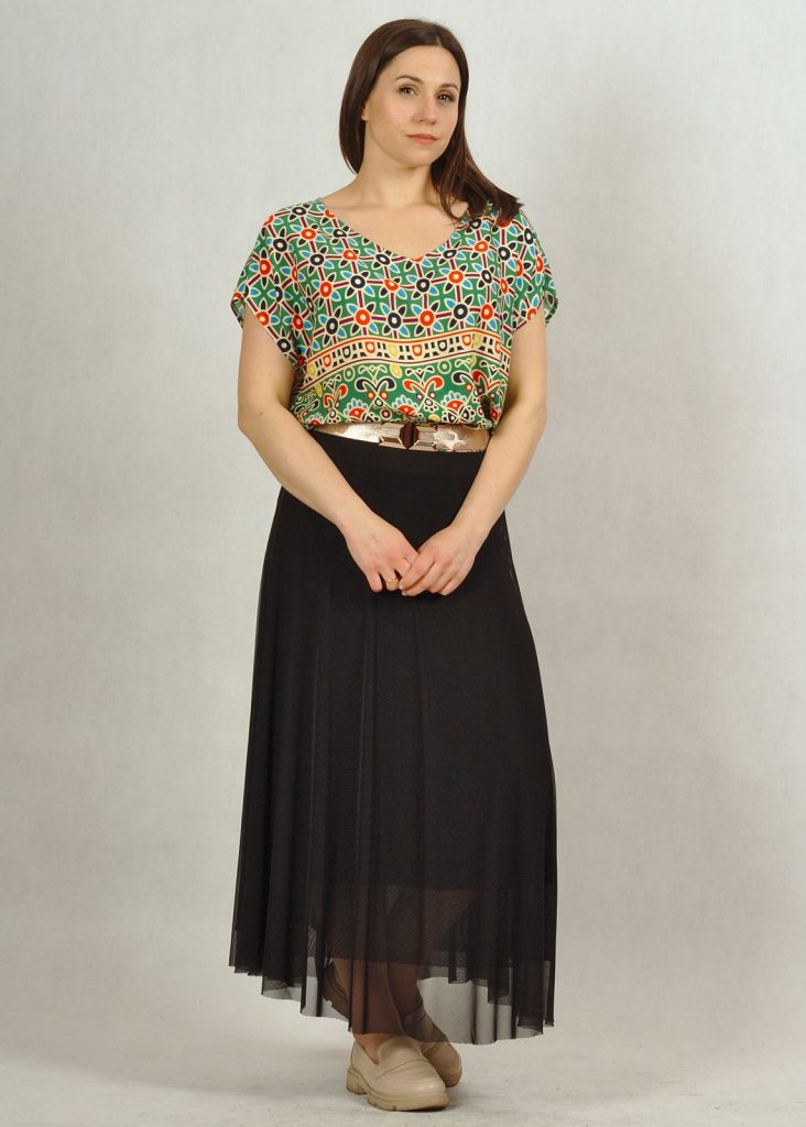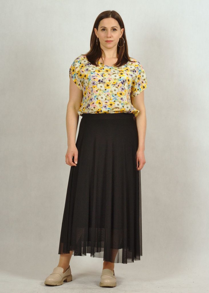 Długa spódnica składająca się z dwóch części – z wiskozowej podszewki z dzianiny oraz z poliestrowej siatki drukowanej.