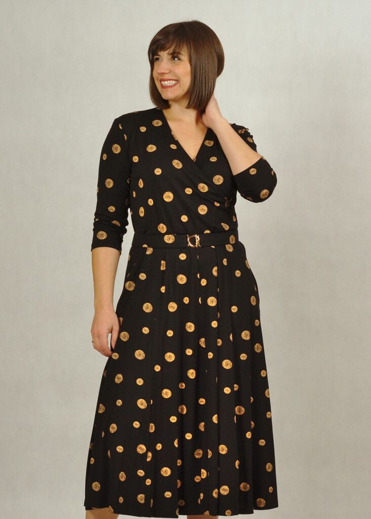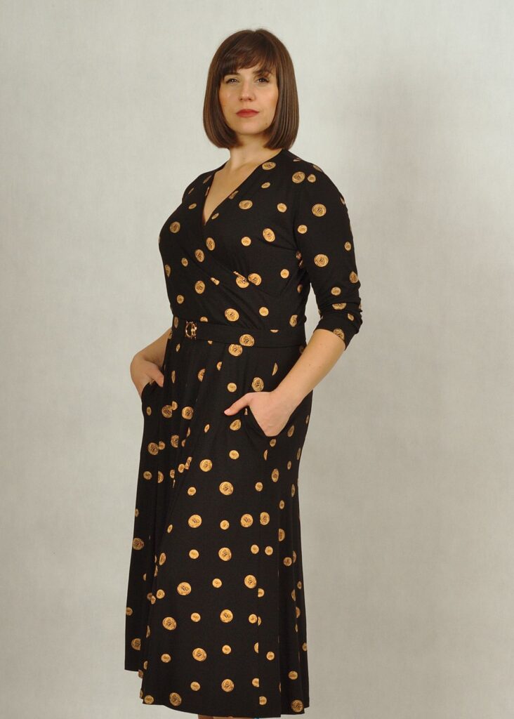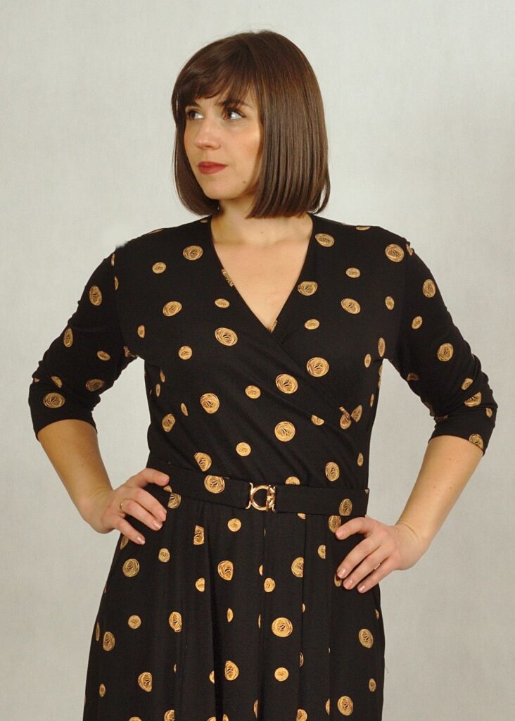 Sukienka czarna w liście ma dołączony elegancki pasek z gumy obszyty dokładnie tym samym materiałem, z piękną złotą klamerką.