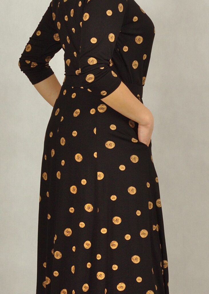 Sukienka ma kolor czarny* z drukiem w złote wzory.