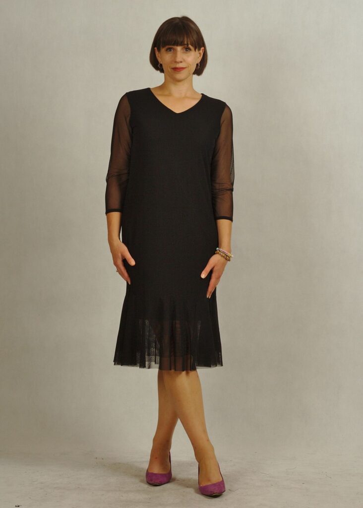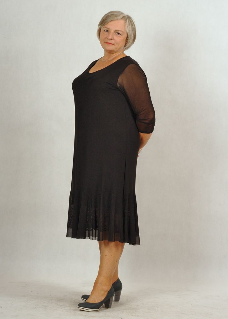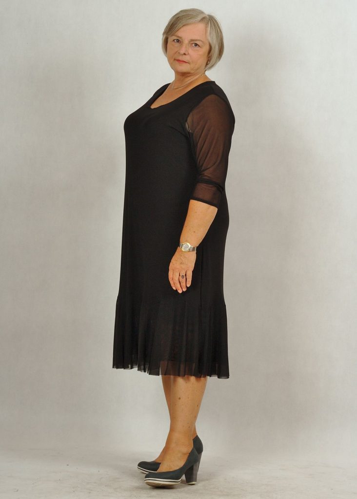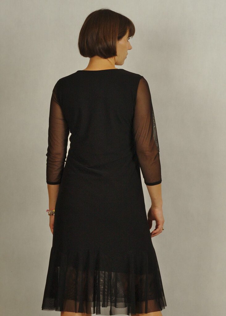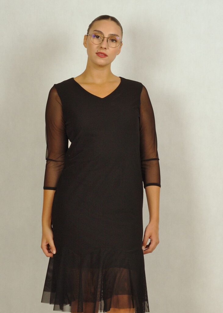 Sukienka premium wykonana jest z dwóch części: wiskozowej, wysokiej jakości podszewki w kolorze czarnym i bardzo eleganckiej tkaniny z siatki, wykończonej zmysłową falbanką na dole. Dekolt w serek opytcznie wyszczupli sylwetkę, rękaw za łokieć przykryje subtelnie ramiona. W tym miejscu siatka jest przezroczysta.