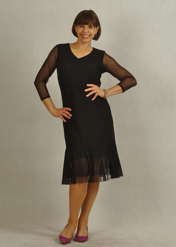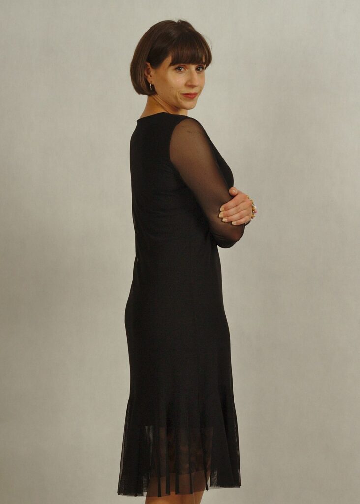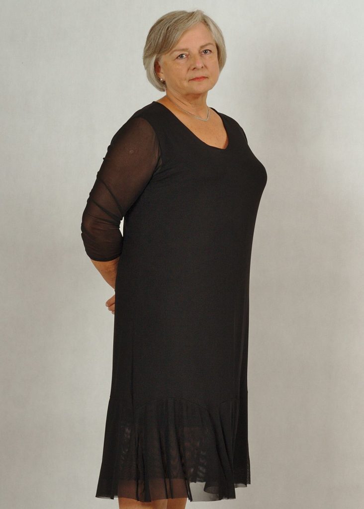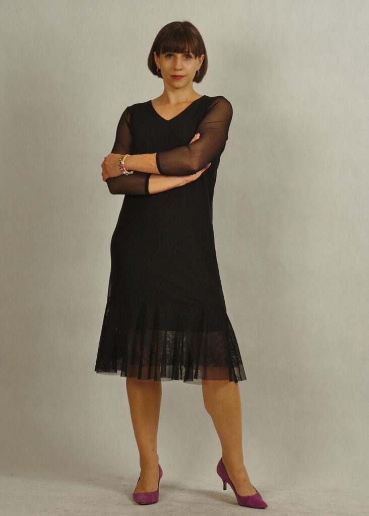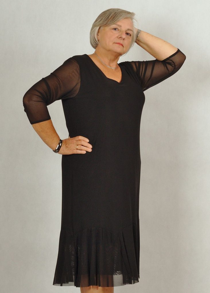 Sukienka premium wykonana jest z dwóch części: wiskozowej, wysokiej jakości podszewki w kolorze czarnym i bardzo eleganckiej tkaniny z siatki, wykończonej zmysłową falbanką na dole. Dekolt w serek opytcznie wyszczupli sylwetkę, rękaw za łokieć przykryje subtelnie ramiona. W tym miejscu siatka jest przezroczysta.