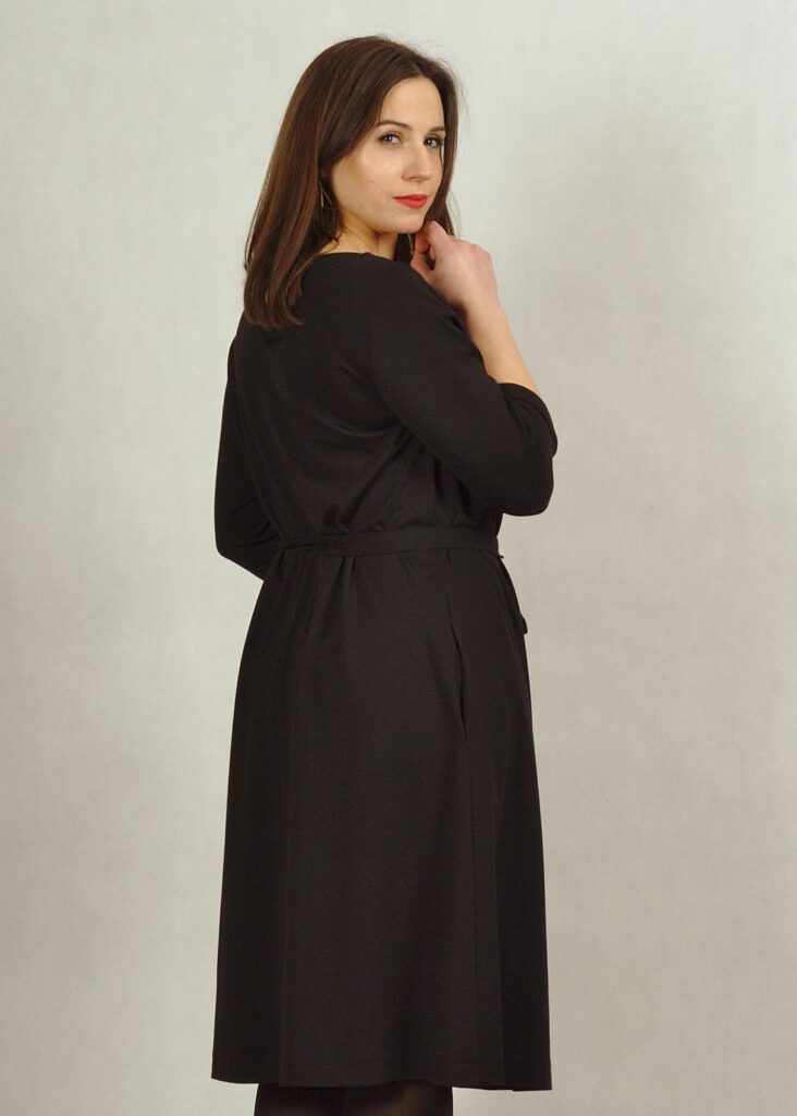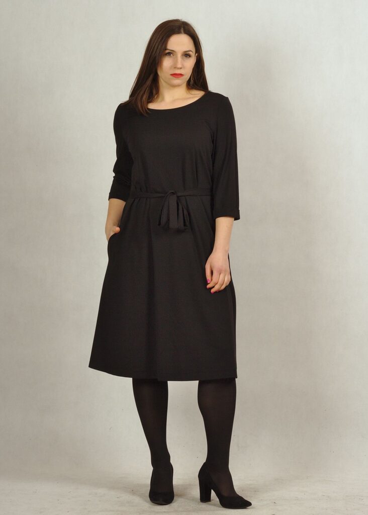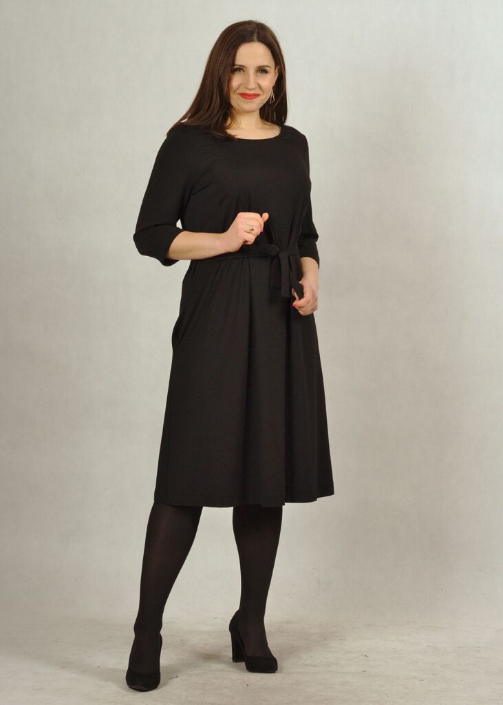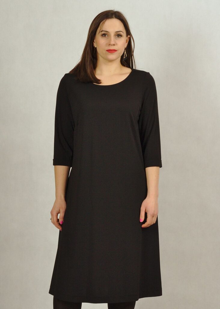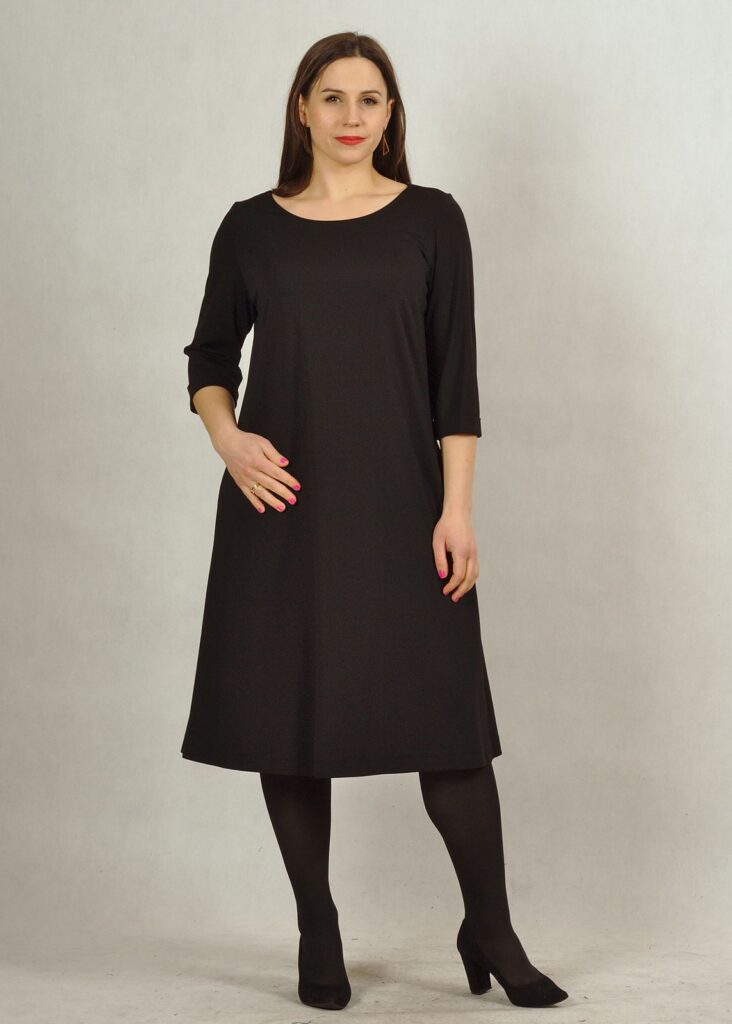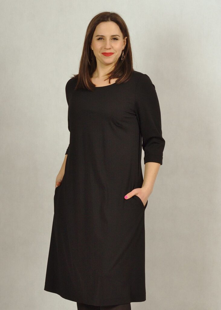 Bardzo bezpieczny dekolt – półokrągły, rękaw za łokieć i pięknie trapezowy fason.