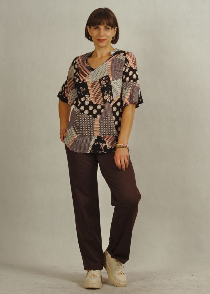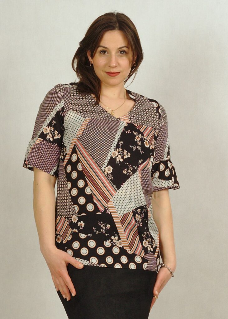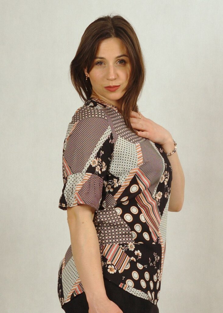 To bardzo oryginalny i nowoczesny model bluzki z krótkim rękawem, zakończonym lekką falbanką.