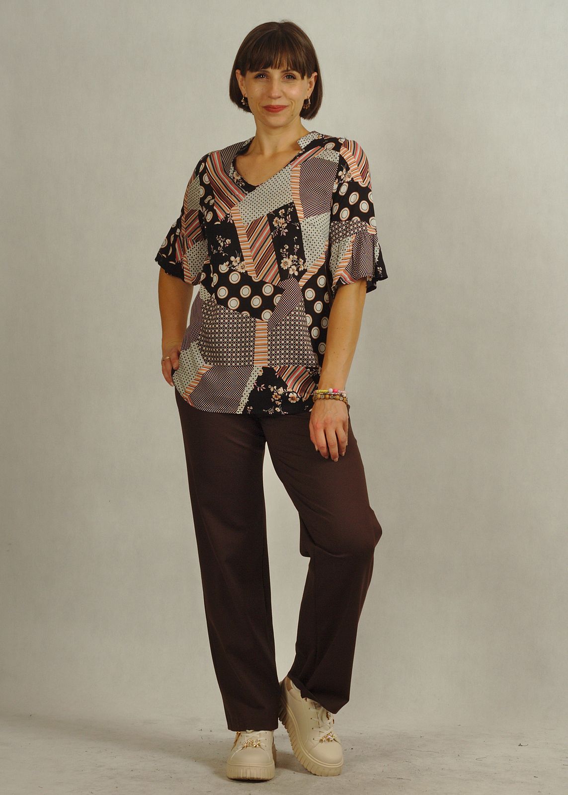 Ma wyjątkowy dekolt w serek, z wykończoną stójką. Długość bluzki sięga za biodra, dzięki temu poczujesz się komfortowo. Bluzka świetnie może wyglądać włożona do spodni lub spódnicy. Zawsze masz wybór.