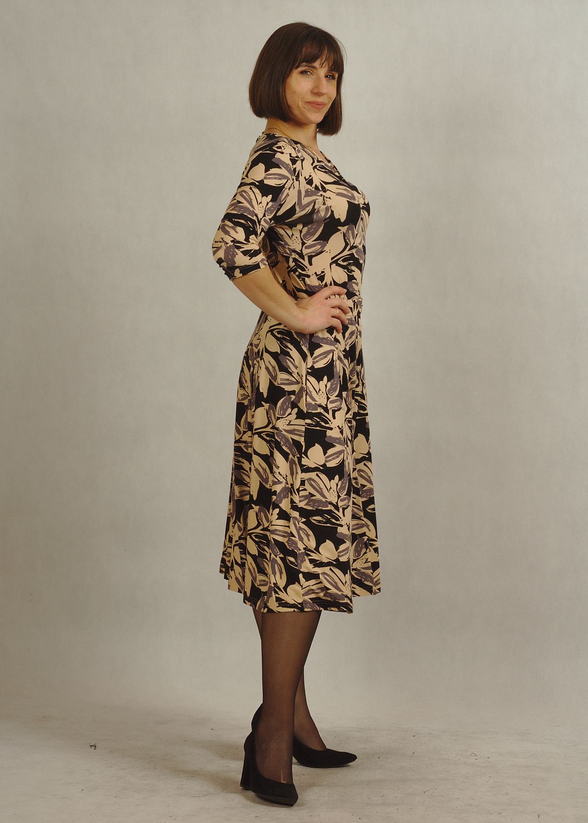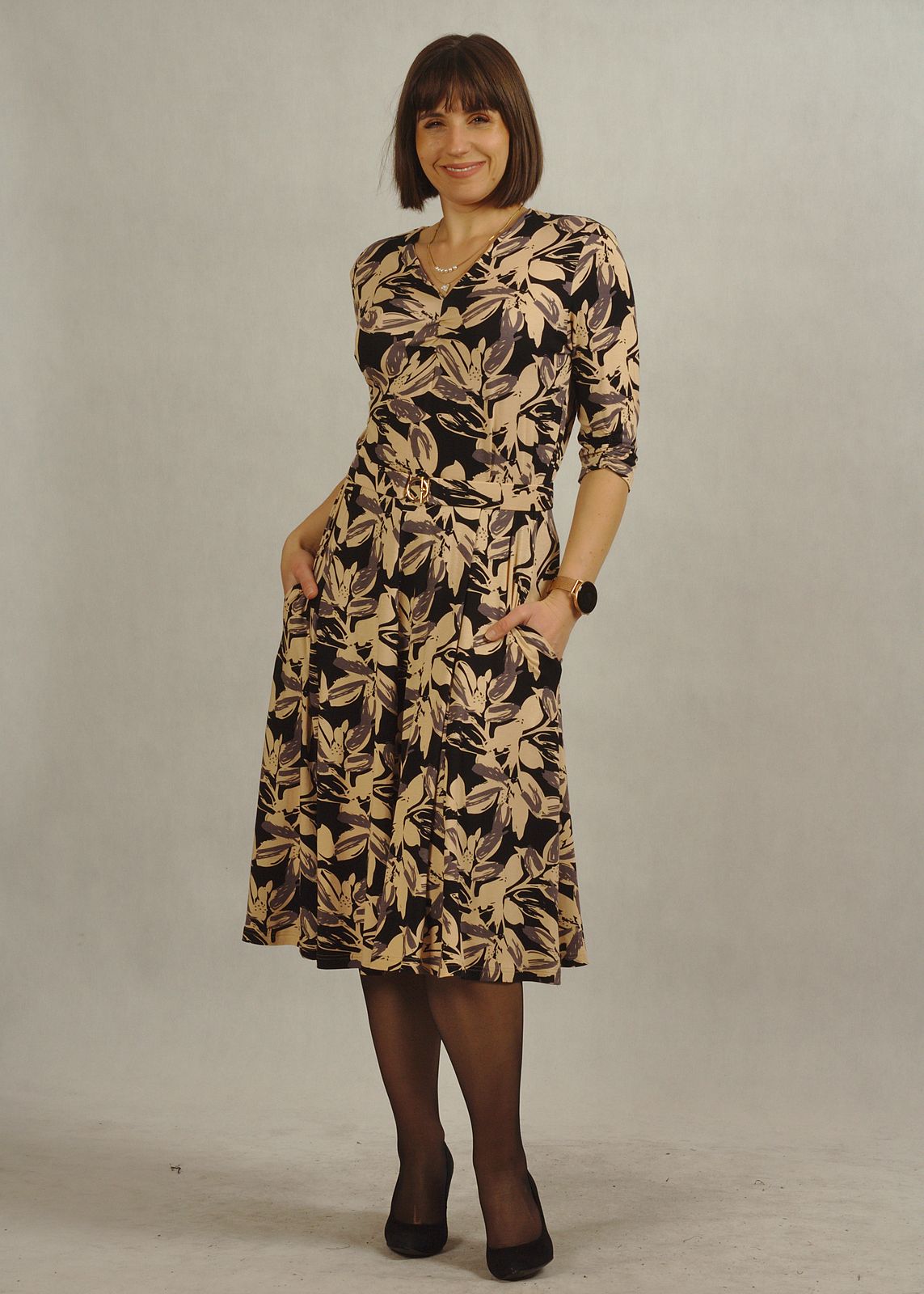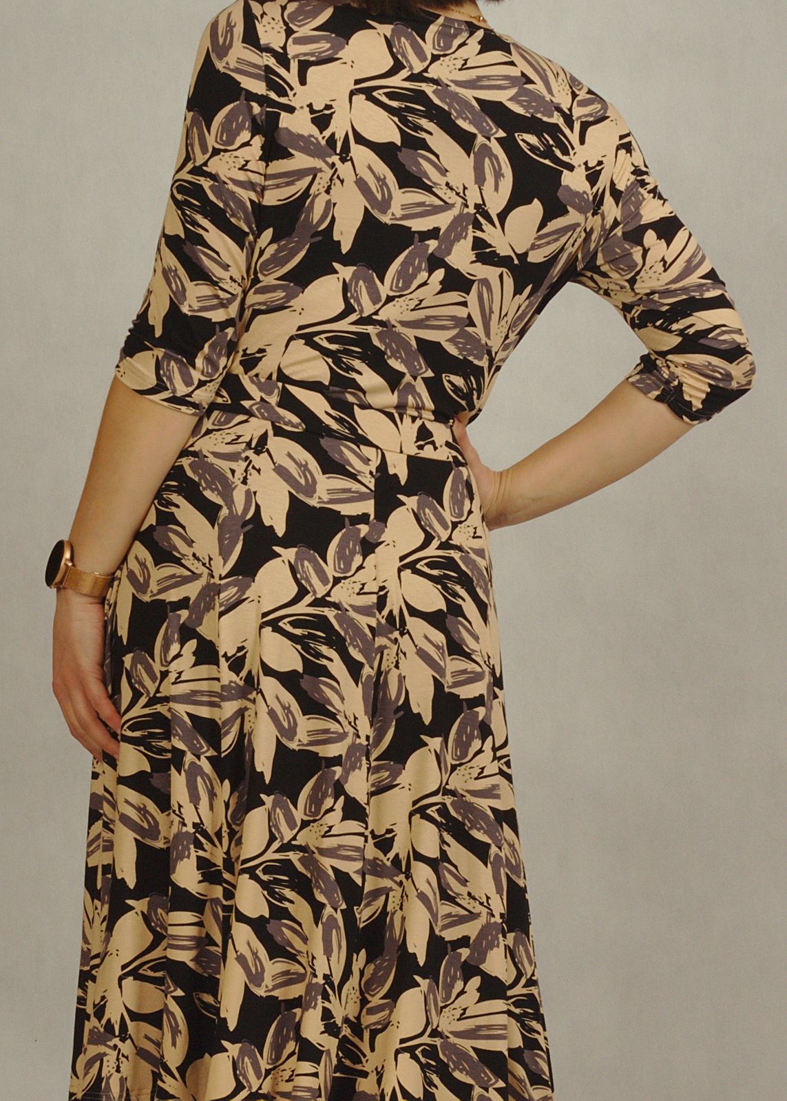 Czarno-beżowa sukienka w szare kwiaty z dekoltem w serek i paskiem/850/