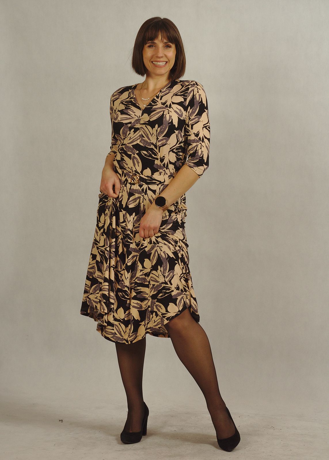 Ta elegancka sukienka łączy klasyczne kolory z subtelnym wzorem, dzięki czemu sprawdza się zarówno na co dzień, jak i na wyjątkowe okazje.