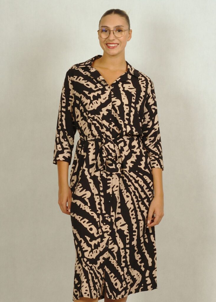 Sukienka z kołnierzykiem ma dołączony pasek, uszyty z tego samego materiału, co sukienka.