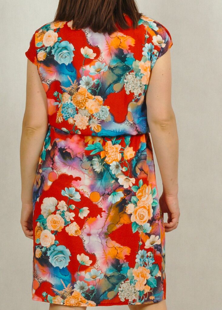 Sukienka posiada dekolt w serek i krótki, opuszczony rękaw (typu kimono).