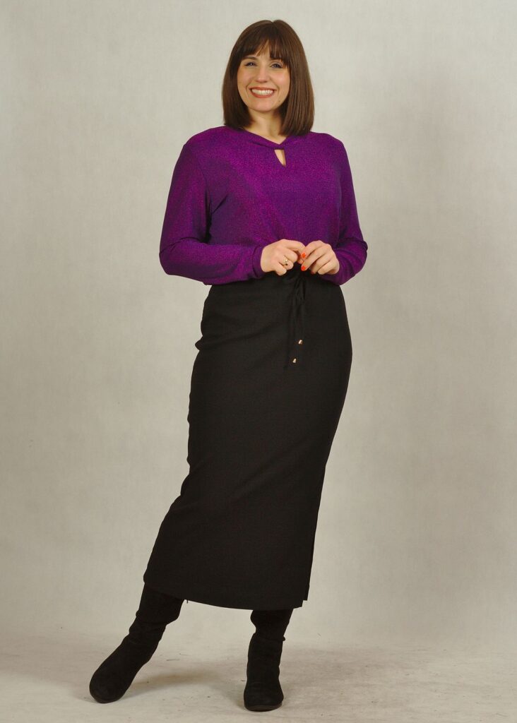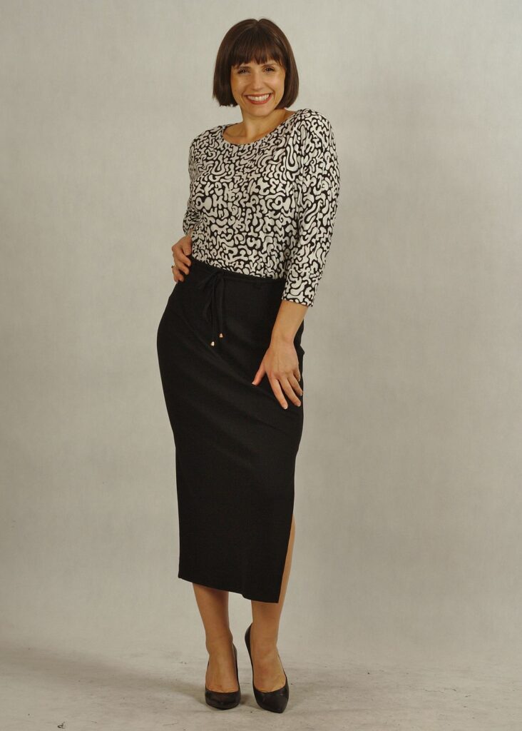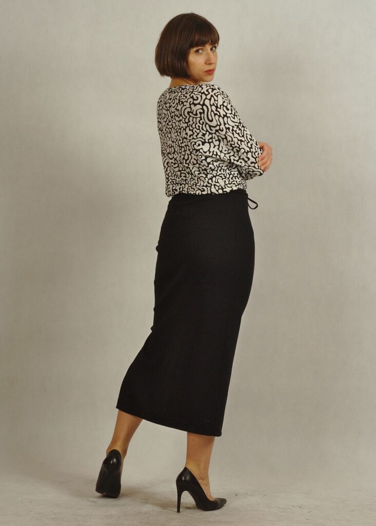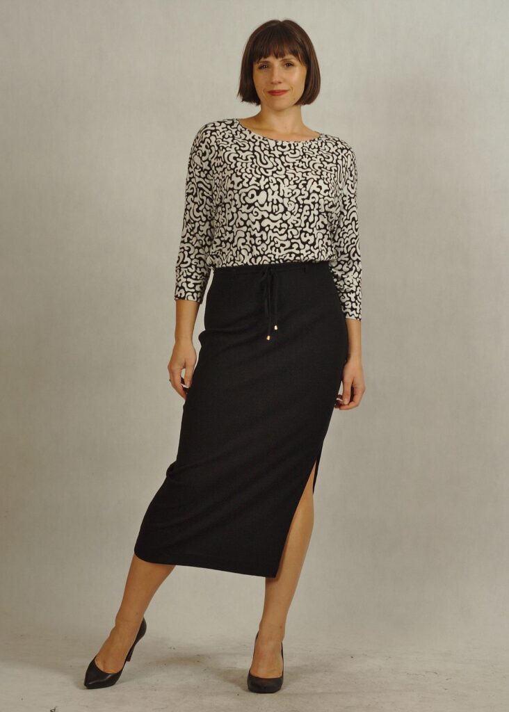 Modna i bardzo wygodna spódnica wykonana z dzianiny prążkowanej w kolorze czarnym.