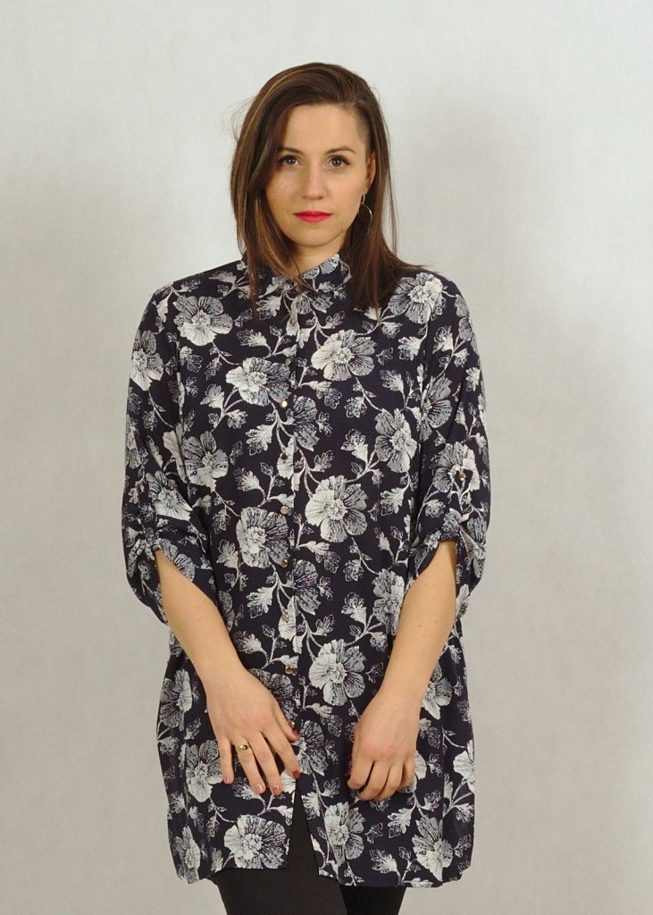 To ponadczasowa wersja koszuli, zapinana na kilkanaście srebrnych guziczków, posiadająca lekko usztywniony kołnierzyk oraz rękaw za łokieć -zapinany na guzik.