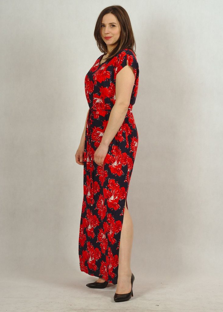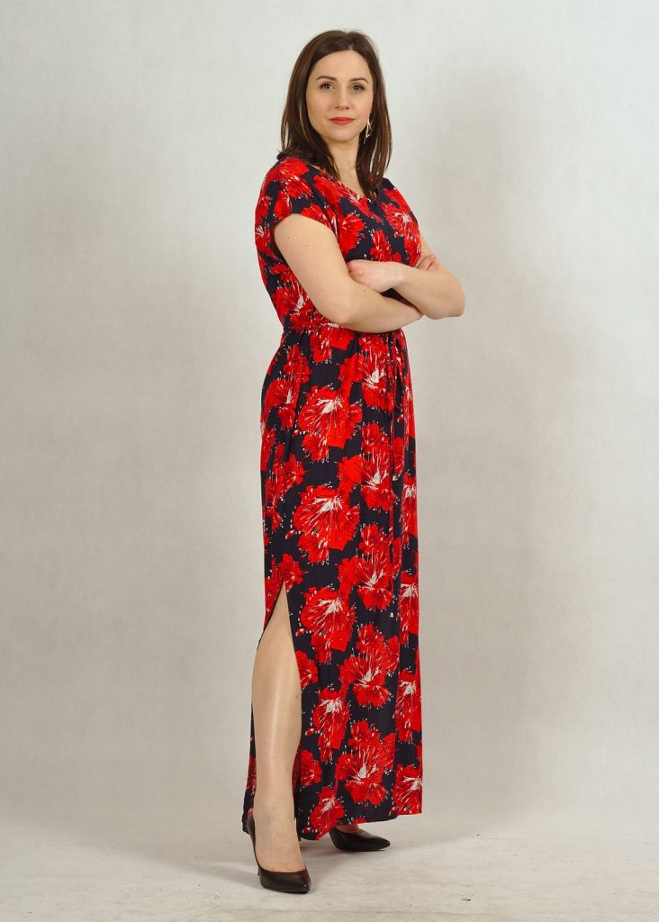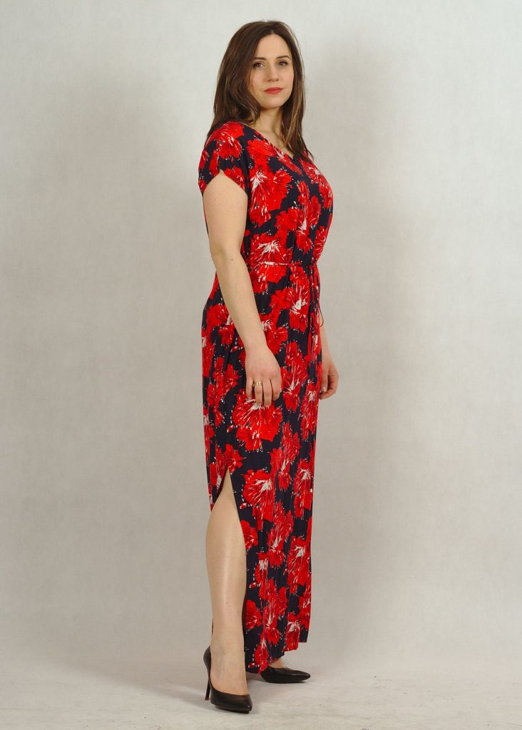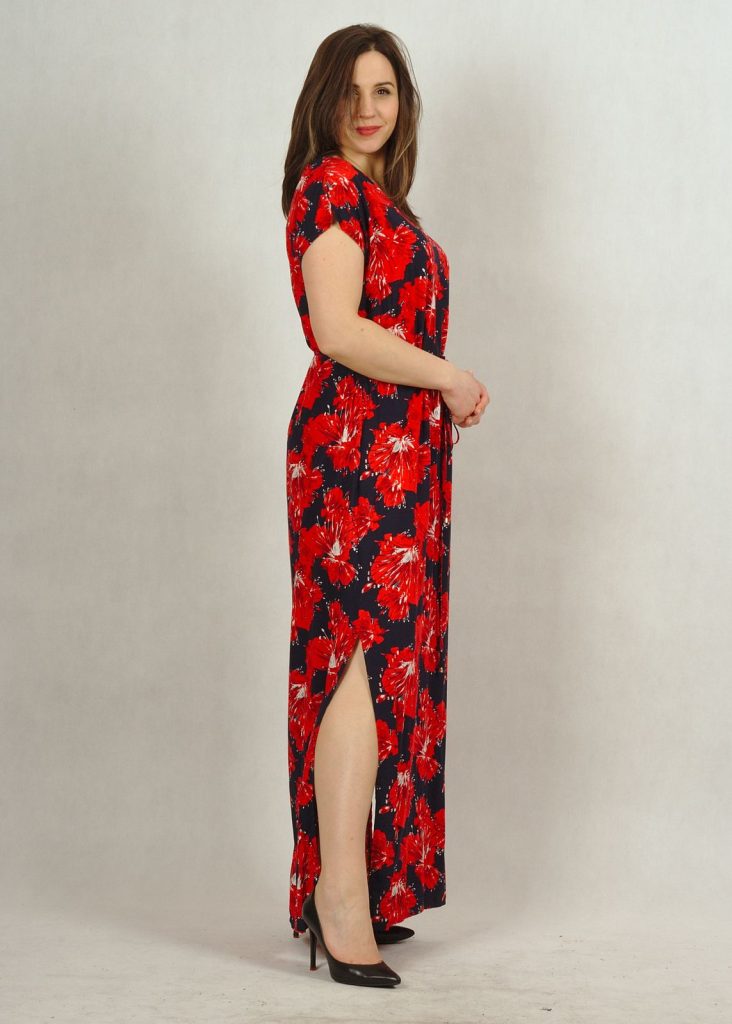 Długa sukienka z wiązaniem w talii z printem w czerwone kwiaty /631/