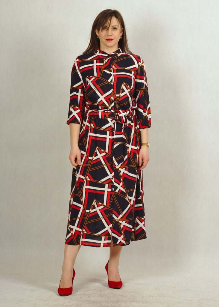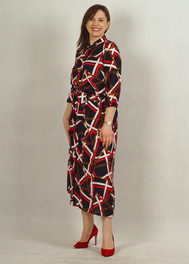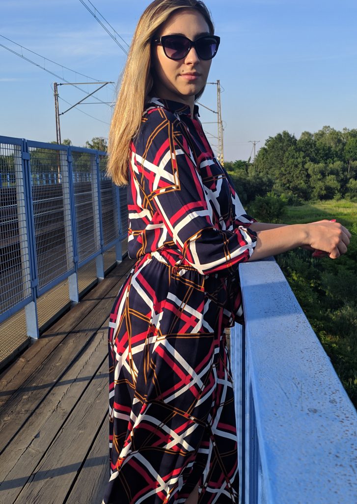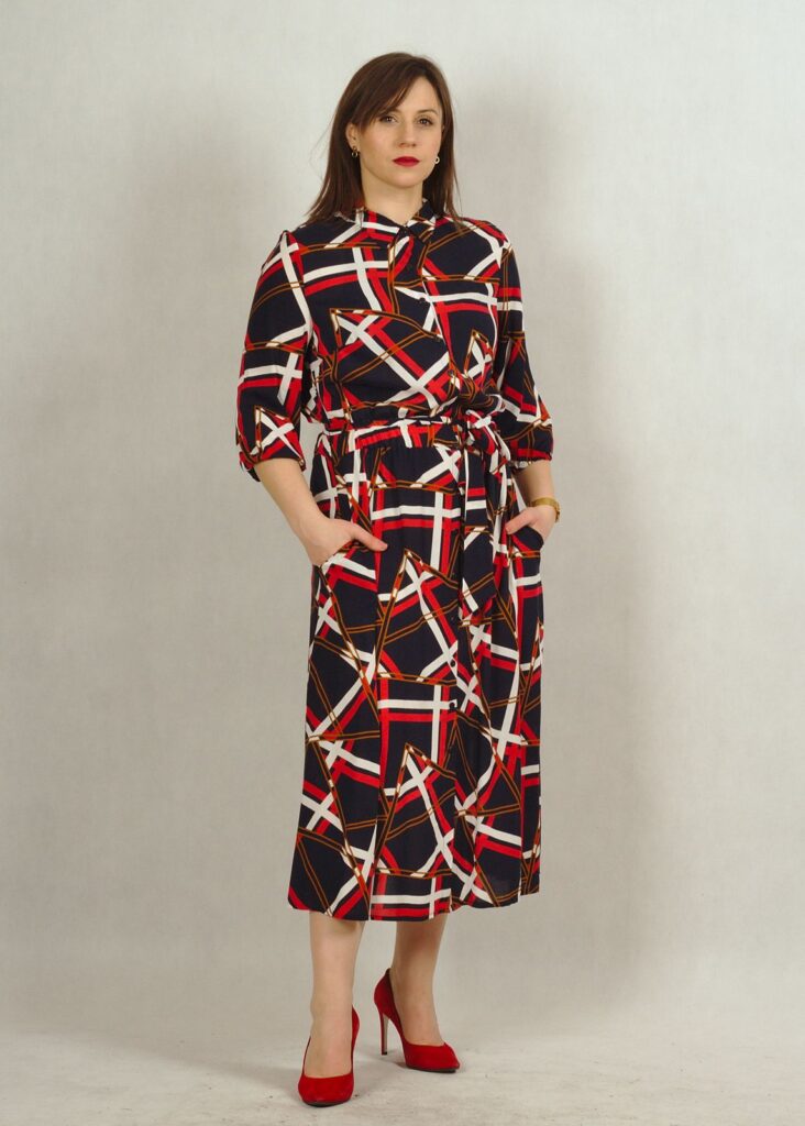 Sukienka posiada kieszenie oraz wiązanie w pasie, wykonane z tego samego materiału,co sukienka.
