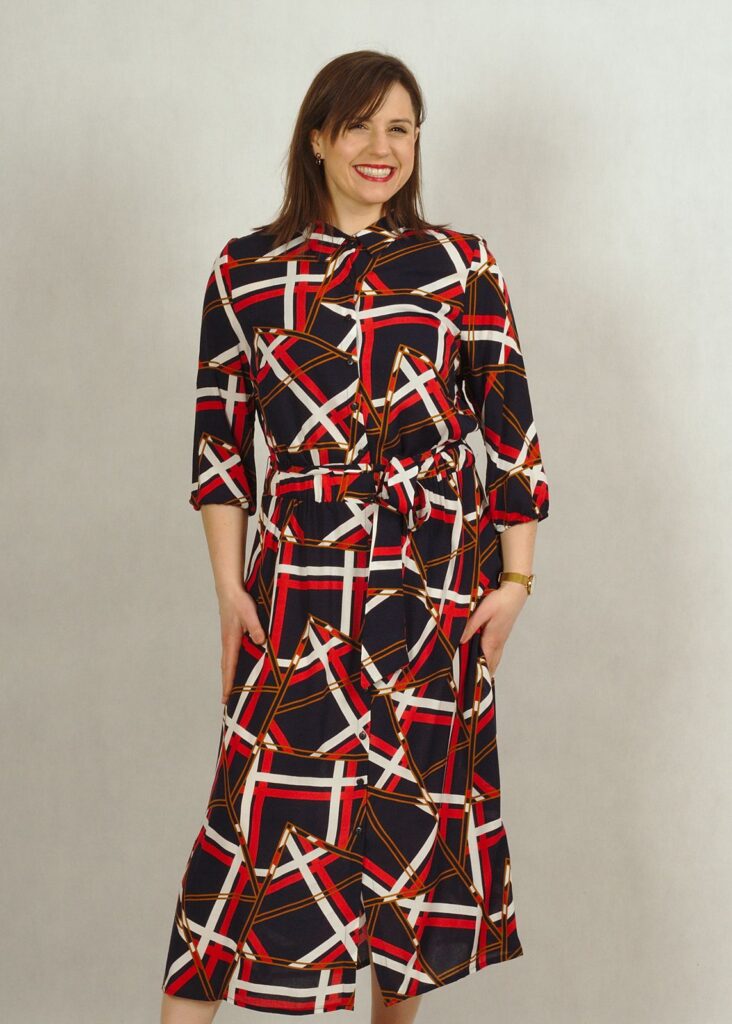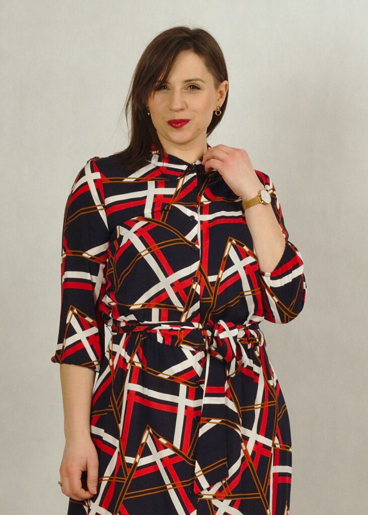 Dekolt wykończony kołnierzykiem, całość zapinana na drobne guziki.