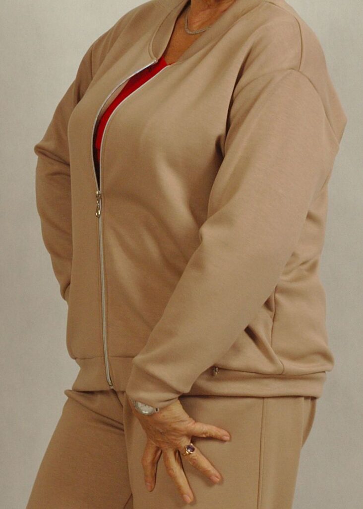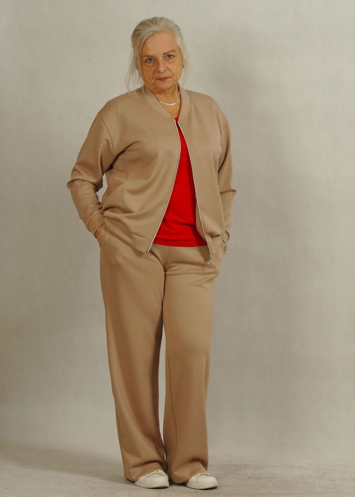 W skład zestawu wchodzi rozpinana bluza z kieszeniami oraz spodnie z prostą nogawką, wykonane z niezwykle przyjemnej dla ciała dzianiny, która zapewnia wygodę na co dzień. Bluza wykończona jest półokrągłym dekoltem z subtelnym srebrnym zamkiem, co dodaje jej elegancji i stylowego charakteru.