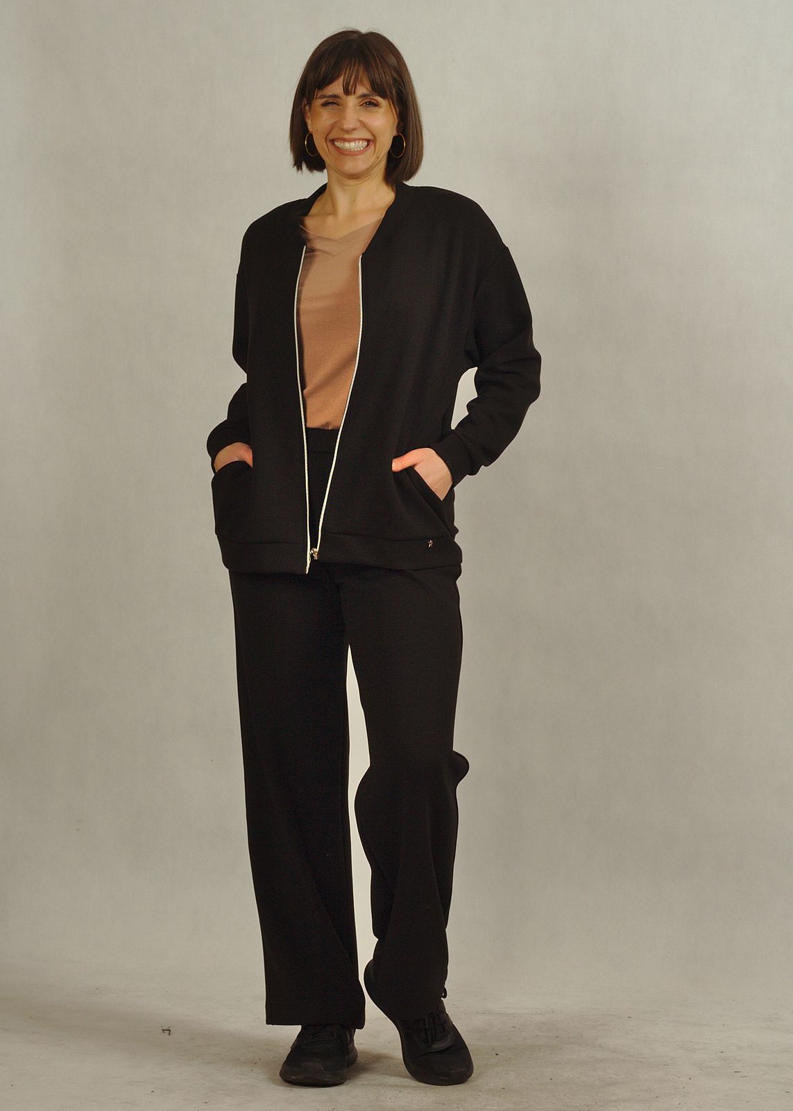 W skład zestawu wchodzi rozpinana bluza z kieszeniami oraz spodnie z prostą nogawką, wykonane z niezwykle przyjemnej dla ciała dzianiny, która zapewnia wygodę na co dzień. Bluza wykończona jest półokrągłym dekoltem z subtelnym srebrnym zamkiem, co dodaje jej elegancji i stylowego charakteru.