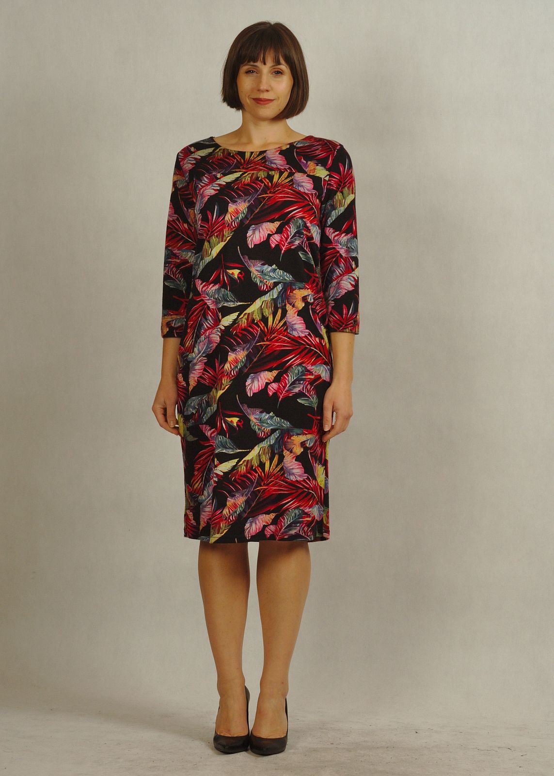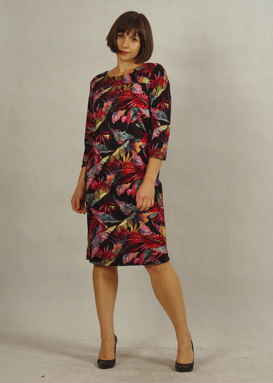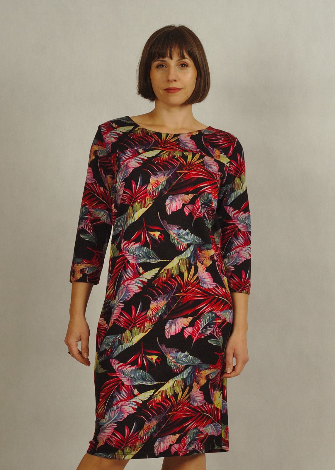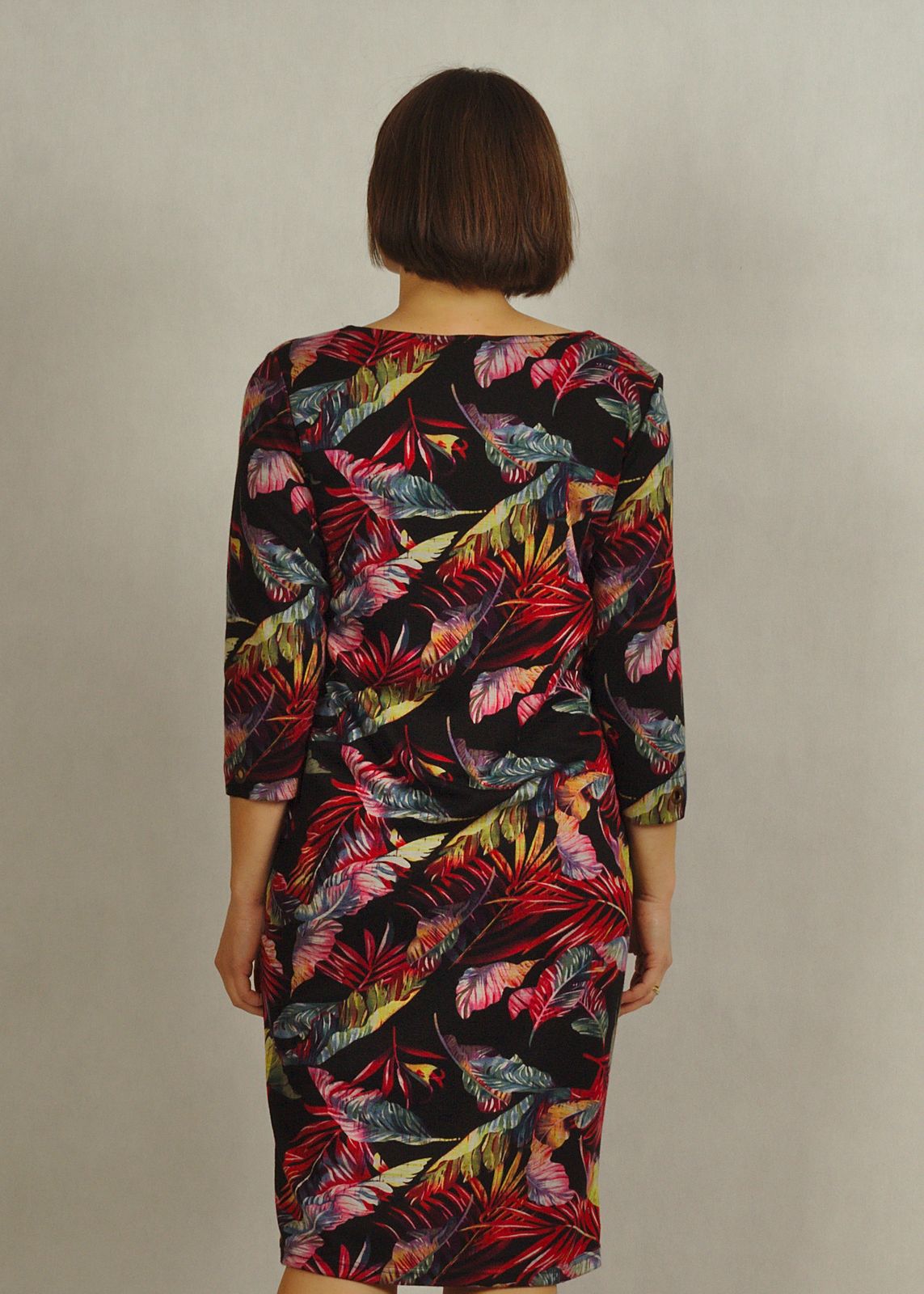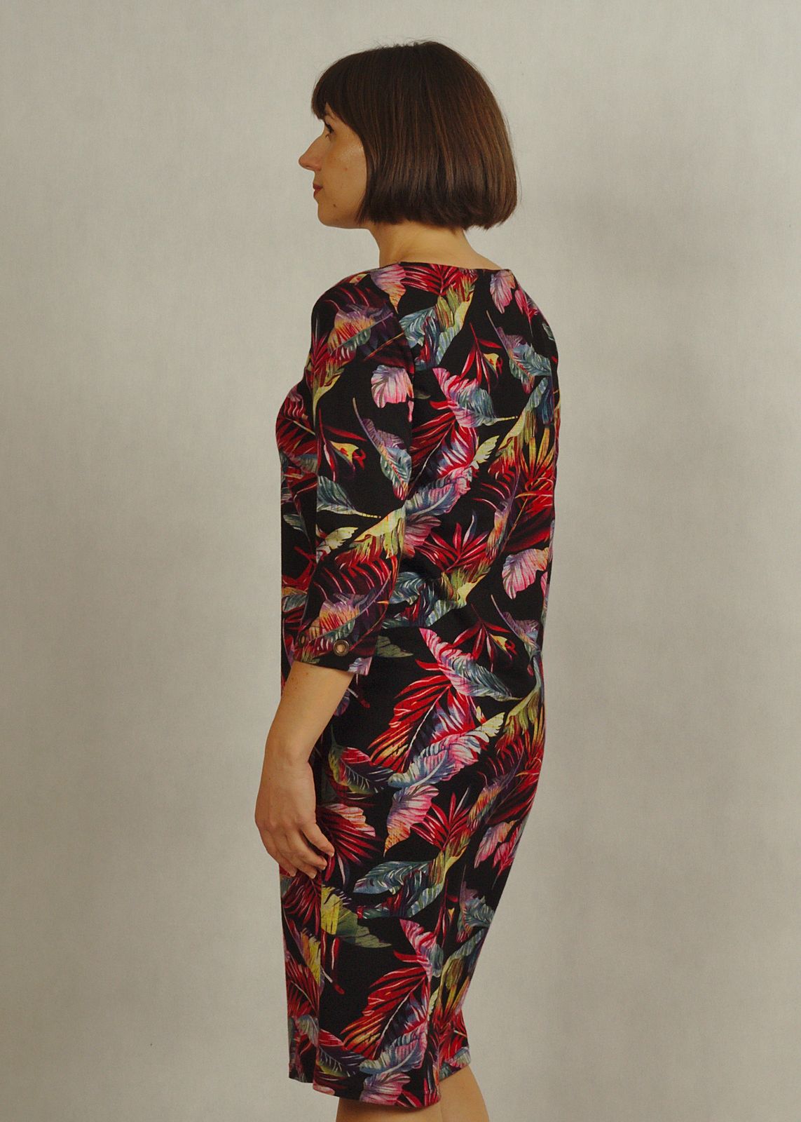 Sukienka z rękawem 3/4 oraz dekoltem półokrągłym zapewnia wygodę i świetnie układa się na sylwetce.