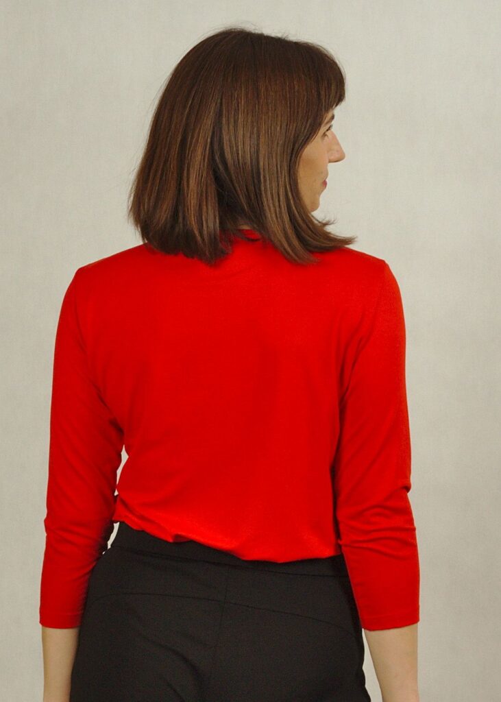 Czerwona bluzka o pięknym, intensywnym odcieniu – pasuje do wielu kolorów, zwłaszcza o podobnym nasyceniu oraz super wygląda do czerni.