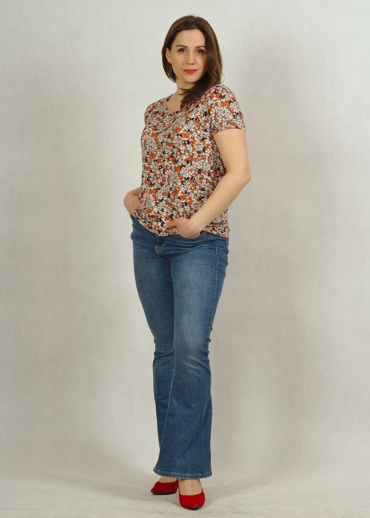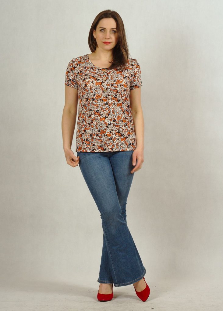 Bluzka ma klasyczny, choć interesujący print kwiatowy w odcieniach pomarańczu.