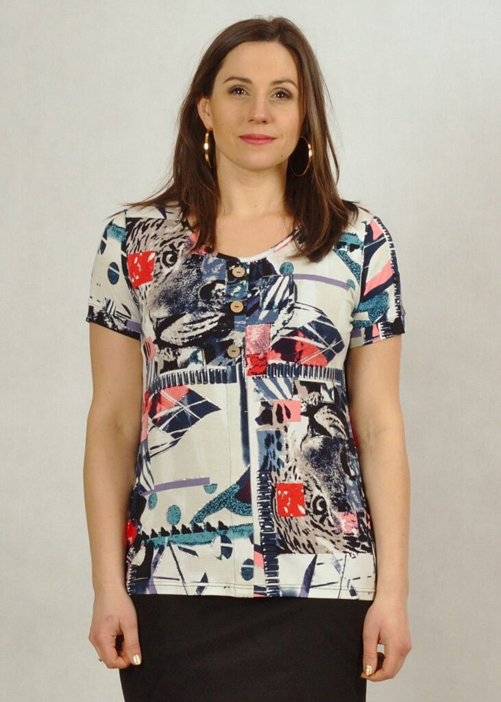Bluzka dostępna w rozmiarach standard i plus size.