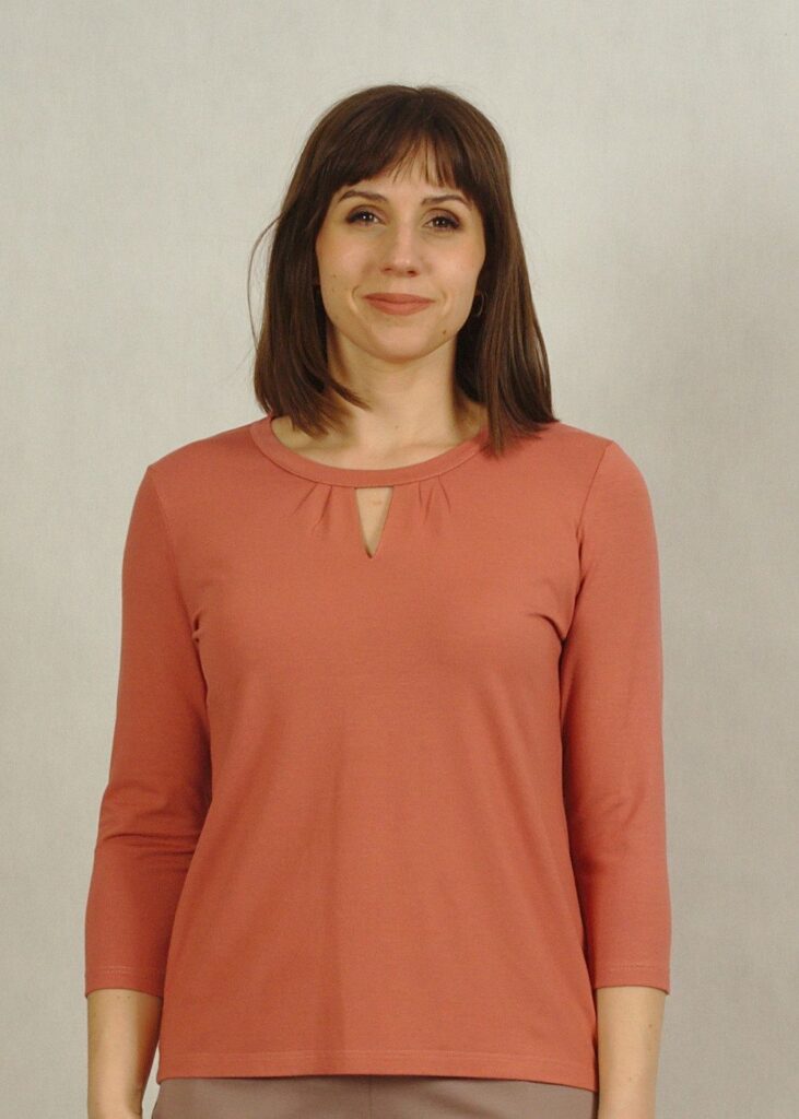 Bluzka o pięknym, ceglanym* odcieniu – pasuje do wielu kolorów, zwłaszcza o podobnym nasyceniu.