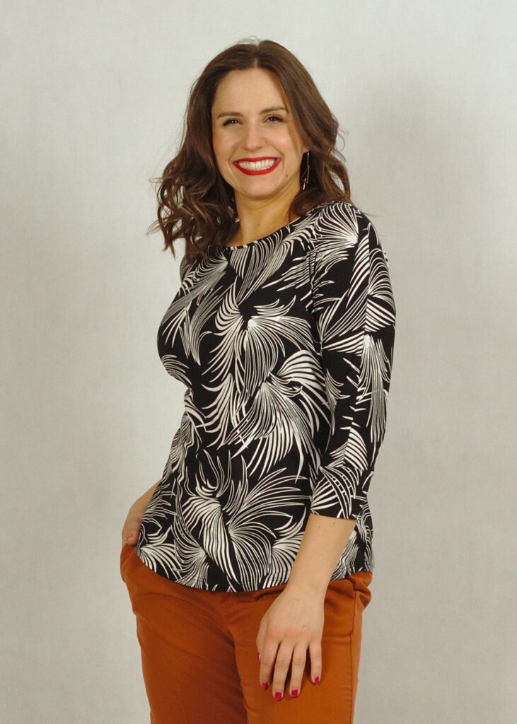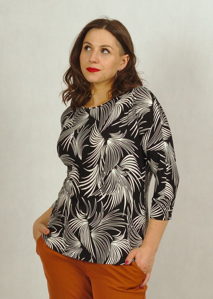 Posiada bezpieczny, półokrągły dekolt. Rękawy 3/4 z lekko poszerzaną przestrzenią pod pachami daje swobodę w użytkowaniu.