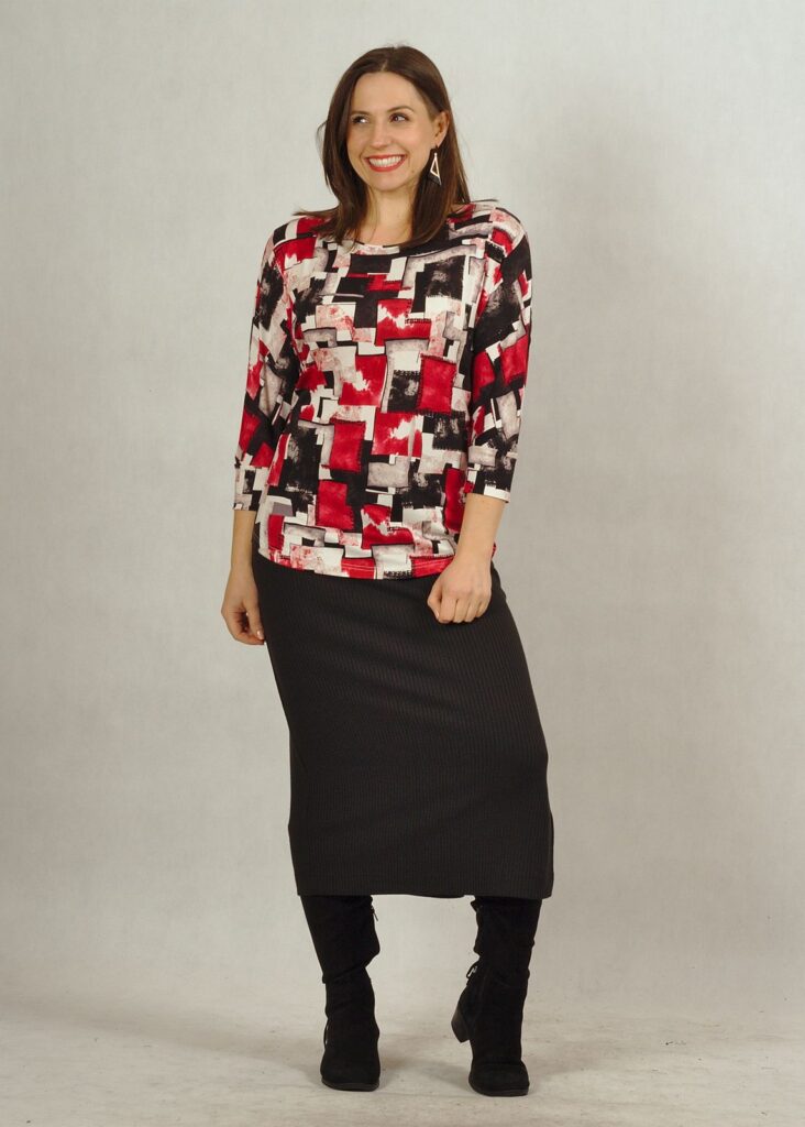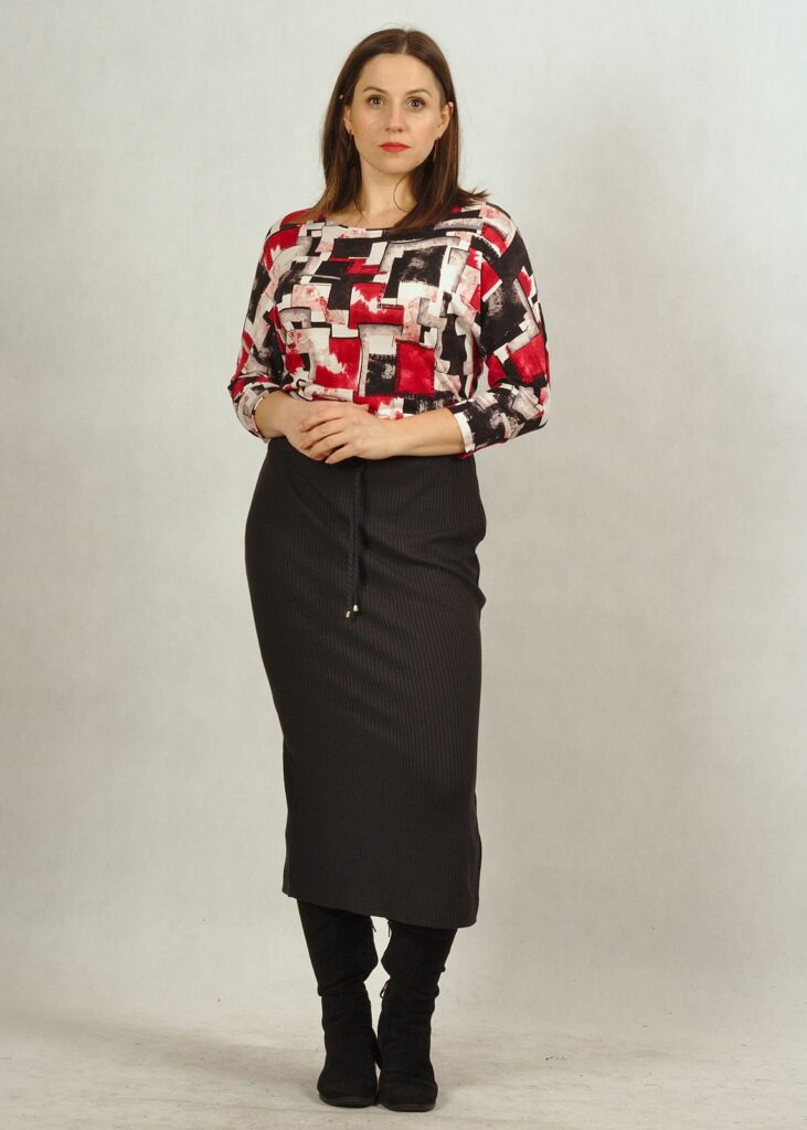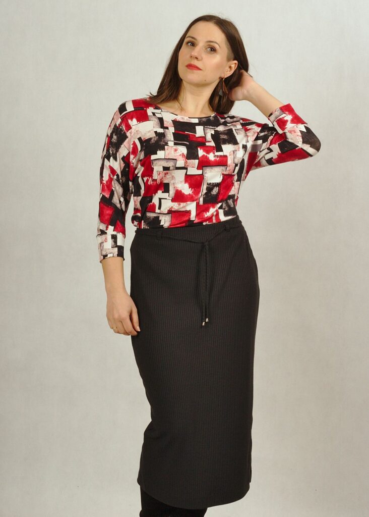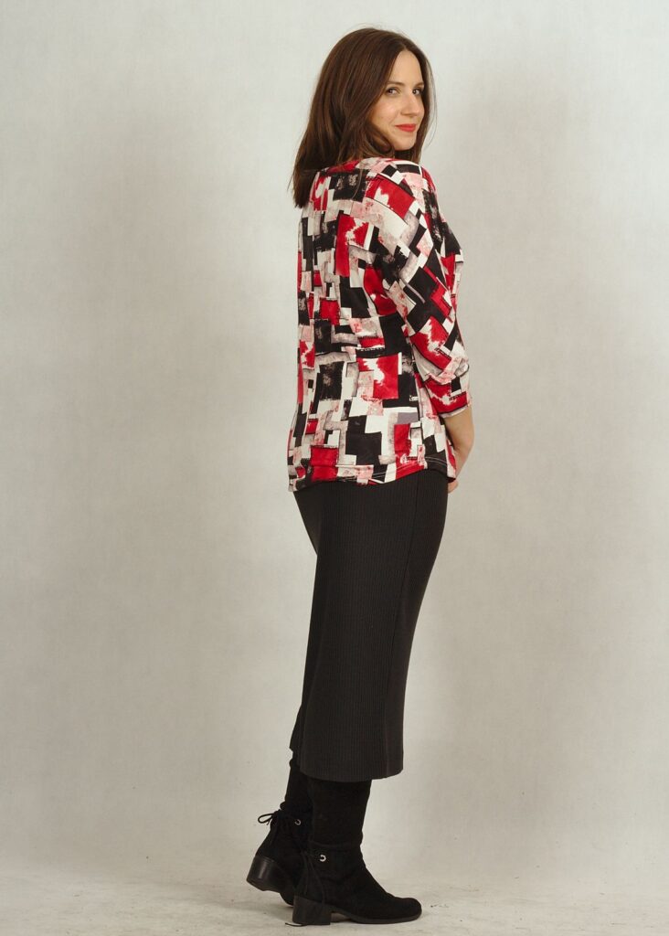 Bluzka posiada półokrągły dekolt. Rękawy 3/4 z lekko poszerzaną przestrzenią pod pachami daje swobodę w użytkowaniu.