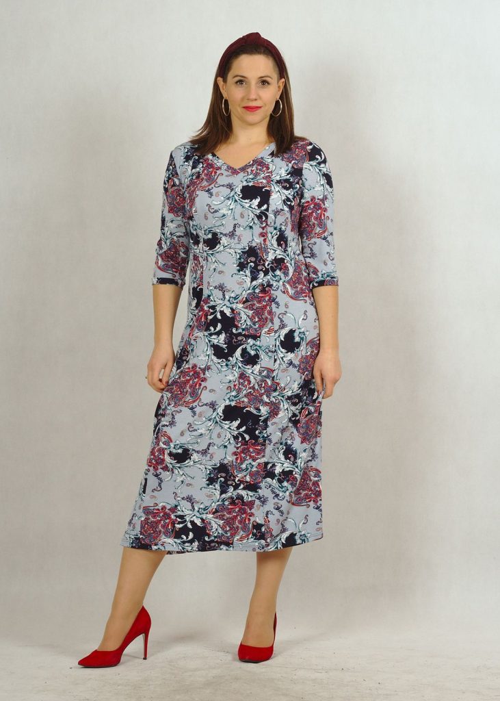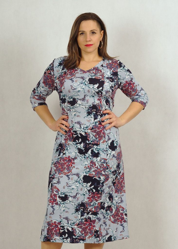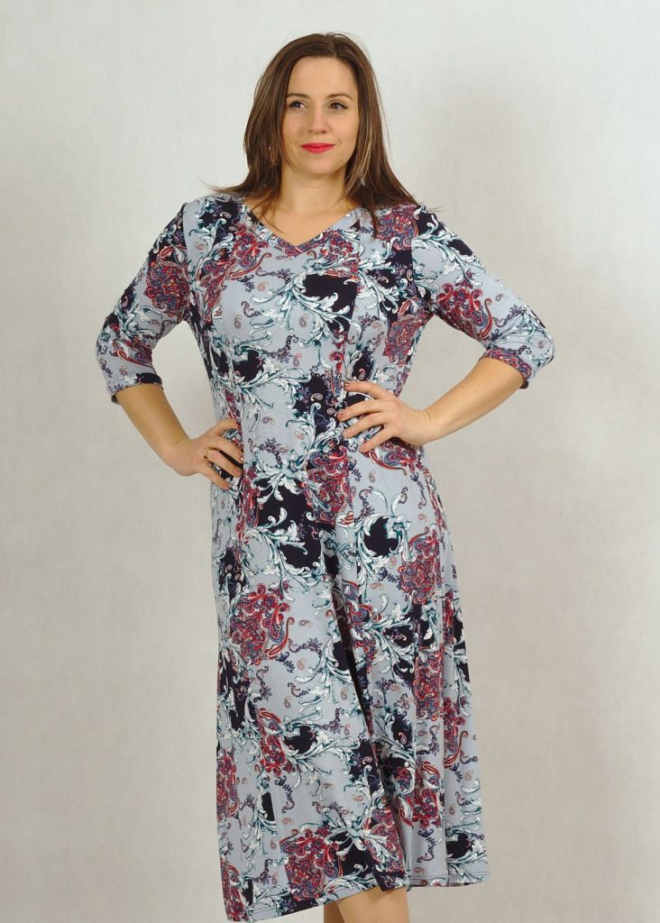 Wiskozowa, dzianinowa sukienka o długości do połowy łydki, o klasycznej, zabudowanej górze.