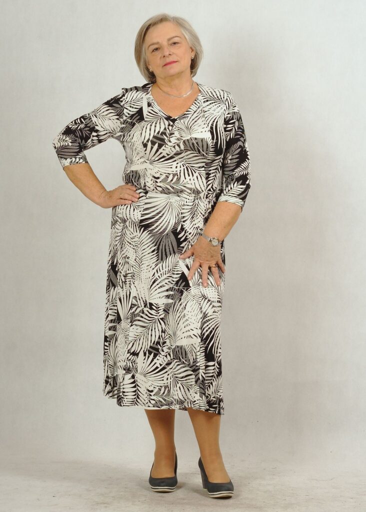 Wiskozowa, dzianinowa sukienka o długości do połowy łydki, o klasycznej, zabudowanej górze.