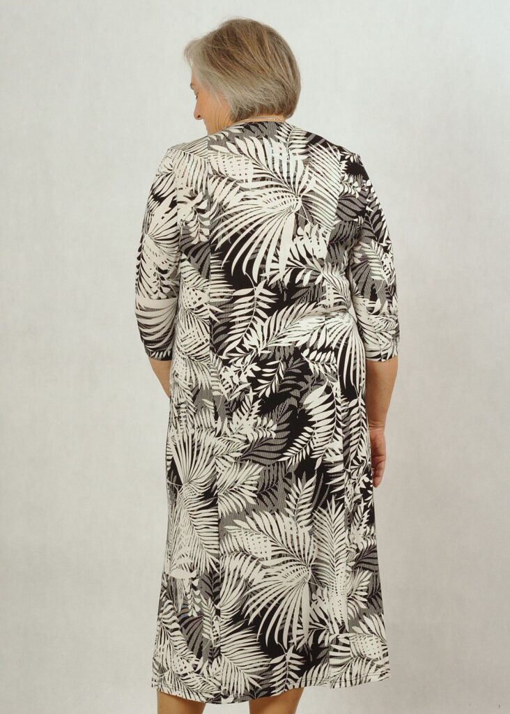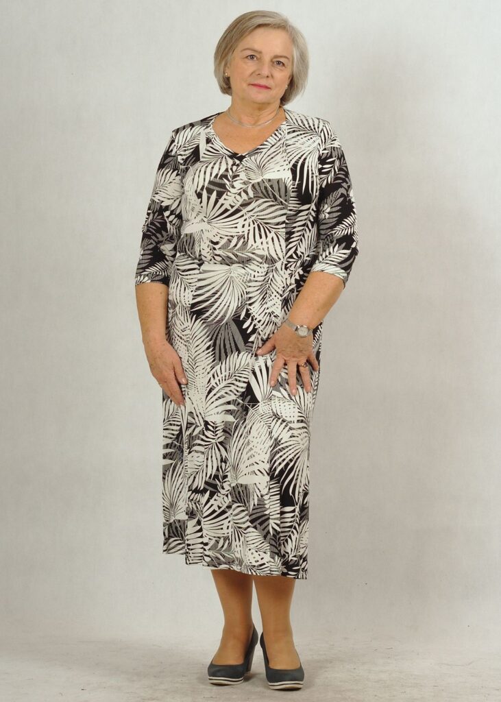 Sukienka to czarno-biała propozycja w eleganckie liście*.