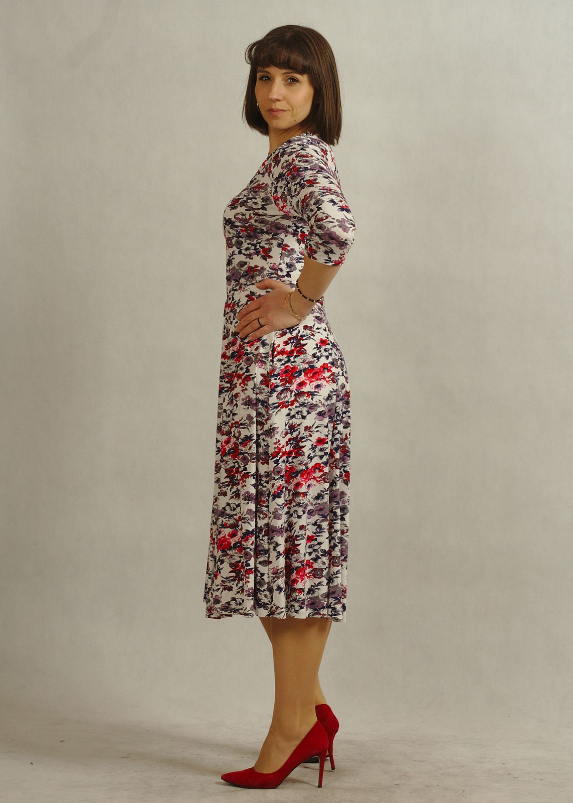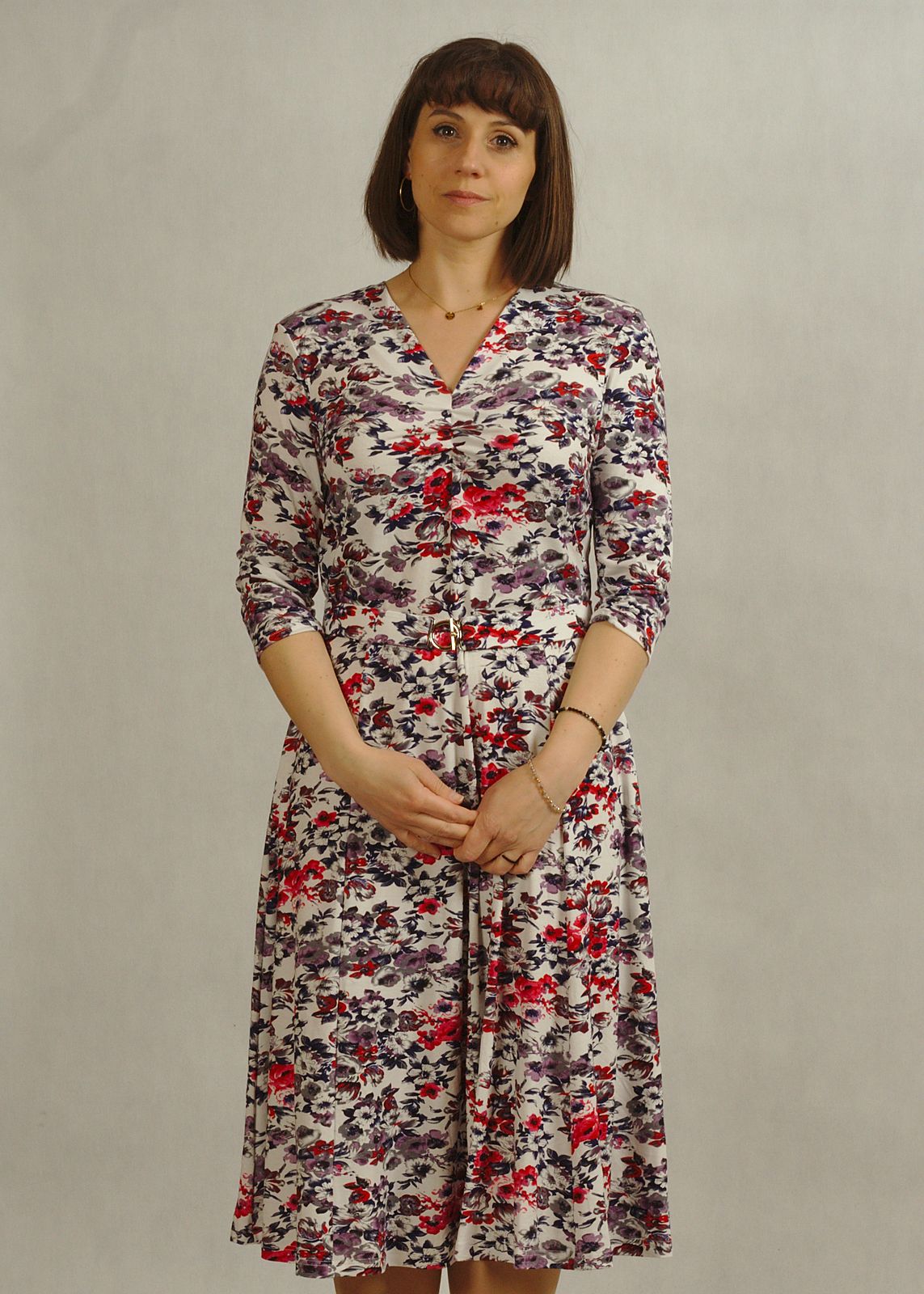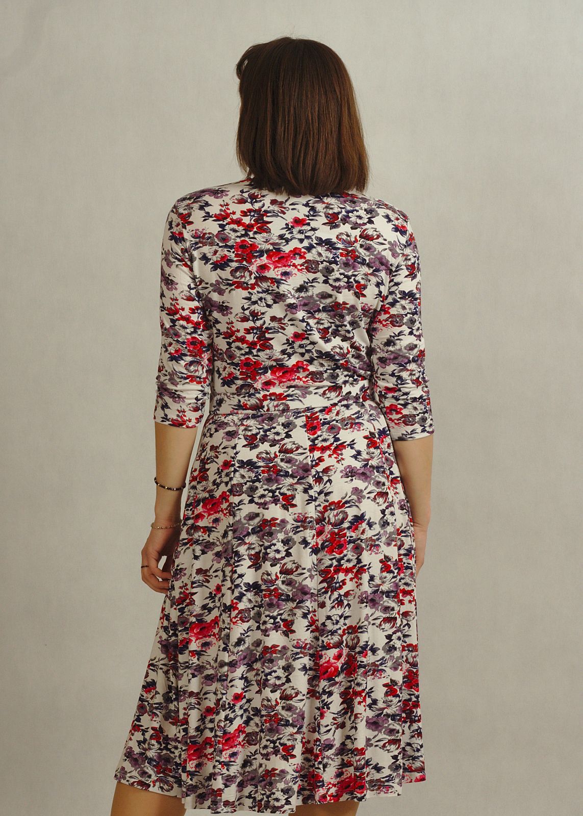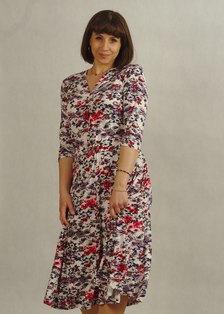 Ta ecru sukienka zachwyca subtelnym printem, dzięki czemu doskonale sprawdzi się na co dzień, do pracy oraz na rodzinne spotkania.