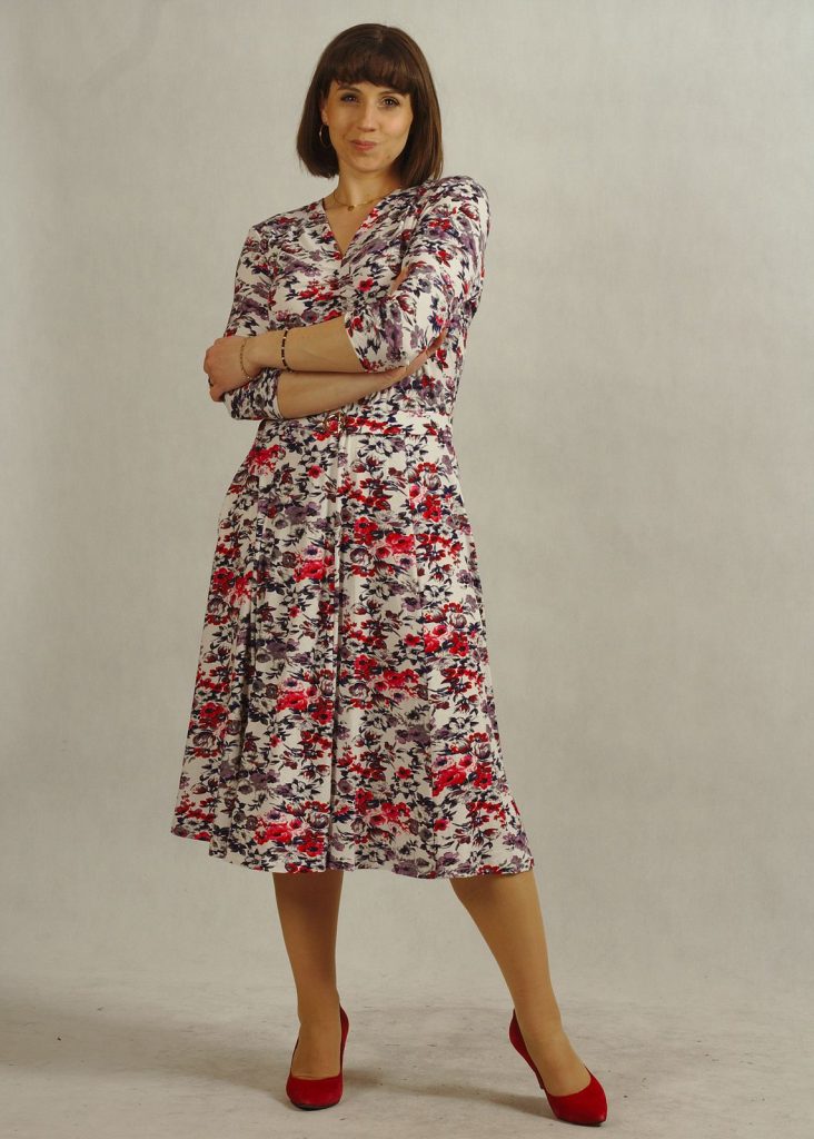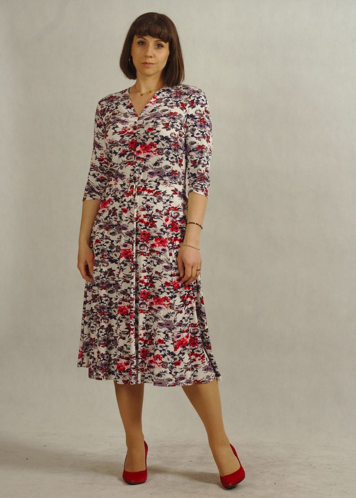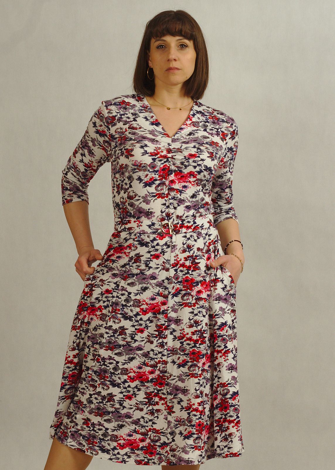 Ecru sukienka w czerwone kwiaty z dekoltem w serek i paskiem/850/