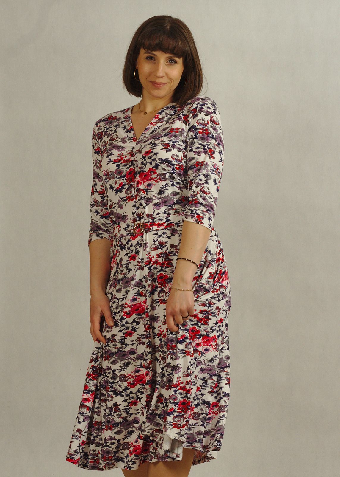 Ecru sukienka w kwiaty to wyjątkowa propozycja dla kobiet ceniących wygodę i elegancję.