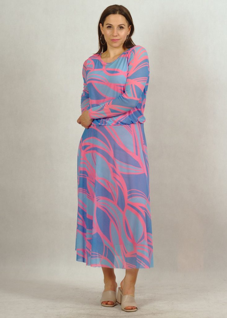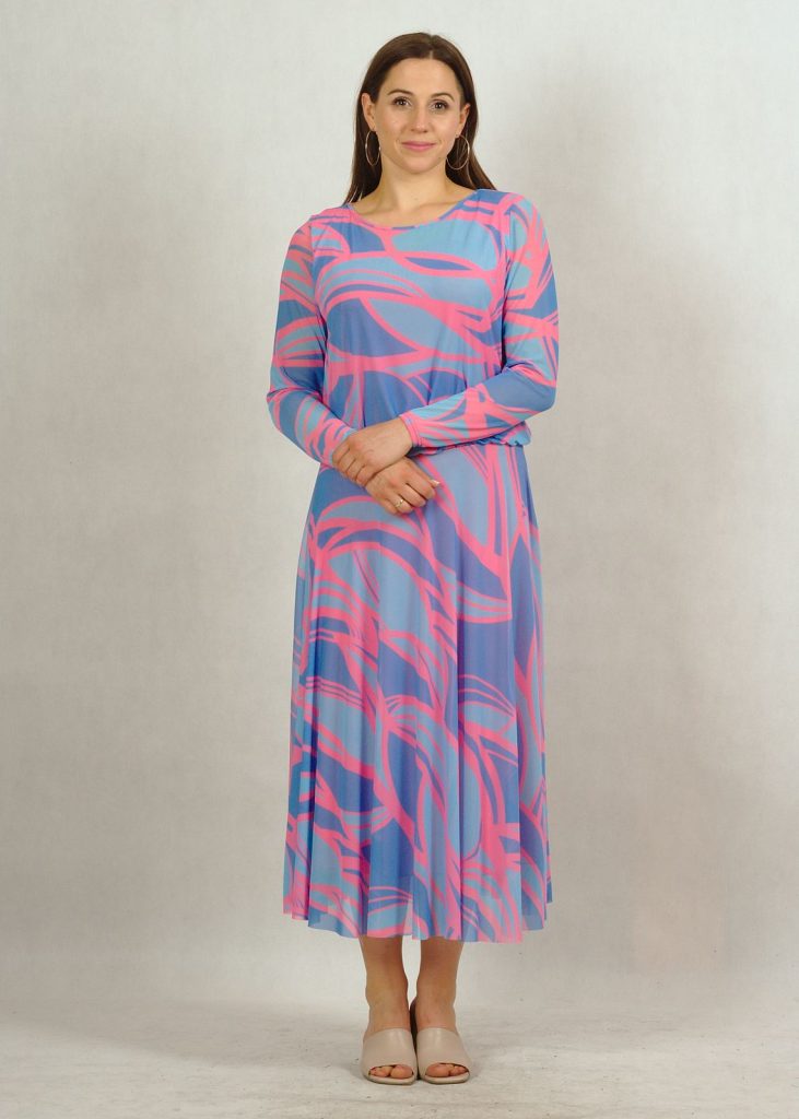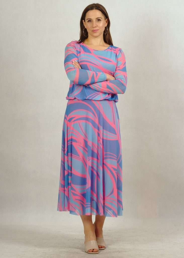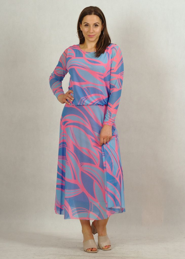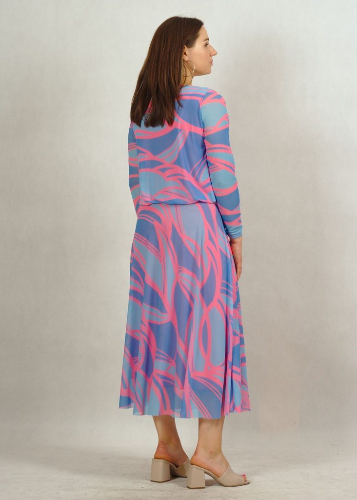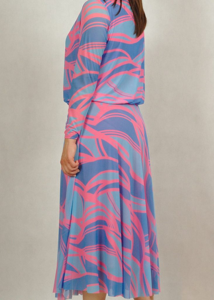Kolorystyka sukienki jest wyjątkowa. Kolor bazowy – błękit, a na nim różne subtelne geometryczne wzory w kolorze różu*.