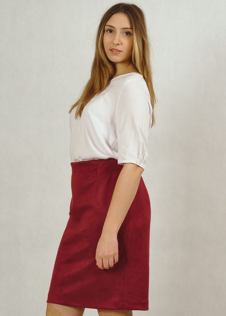 Modelka w bordowej spódnicy ma 172 cm wzrostu i nosi rozmiar M.