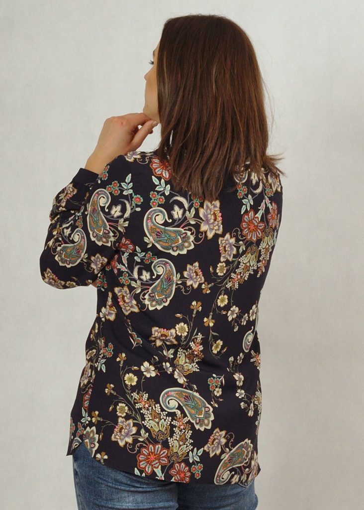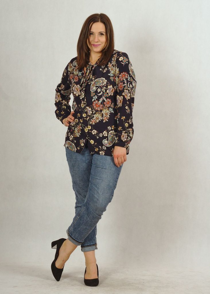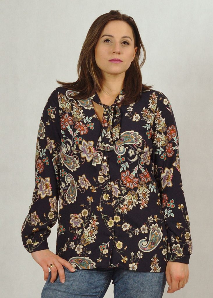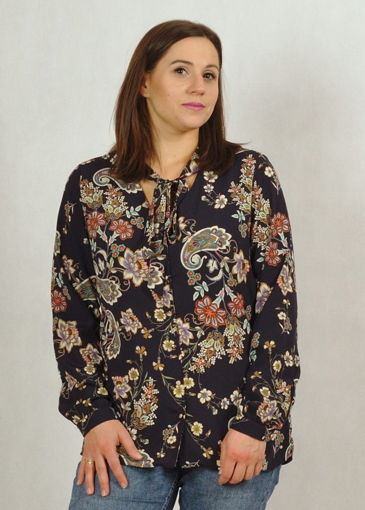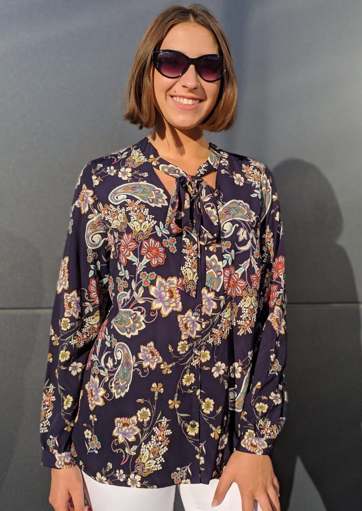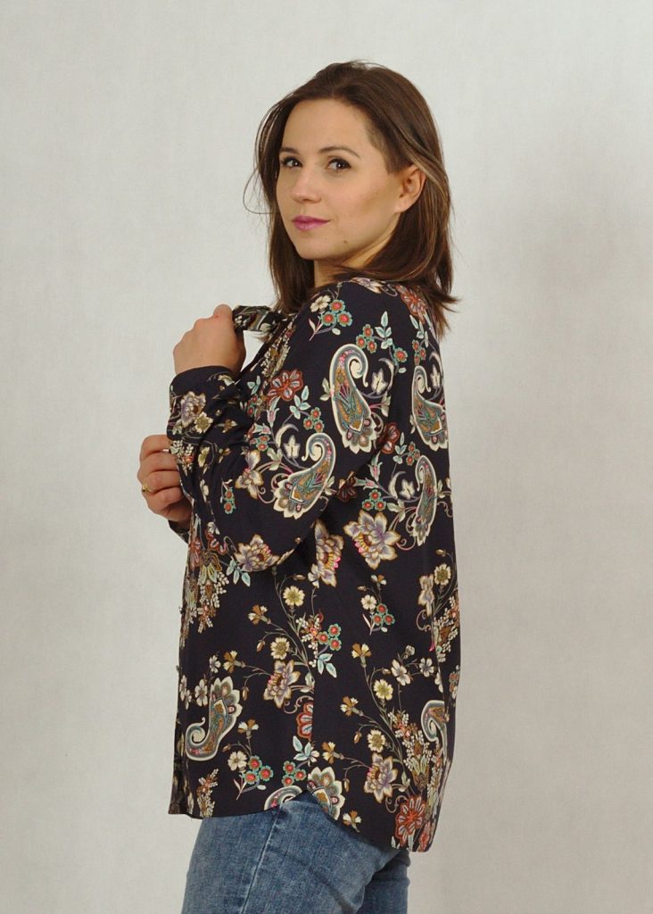 Koszulowa bluzka z długim rękawem i z pięknym wiązaniem przy dekolcie.