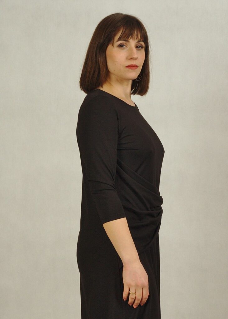 Sukienka z rękawem 3/4 – ślicznie ozdobionym subtelnym marszczeniem.