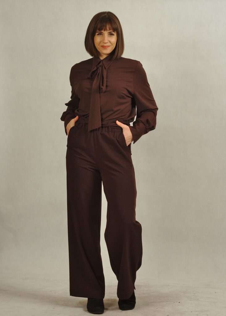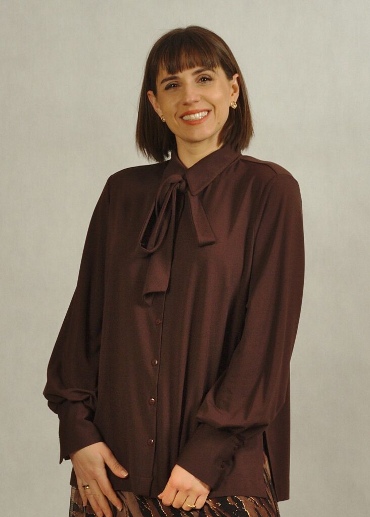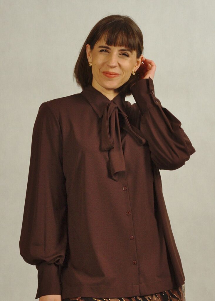 Dzięki dekoracyjnej kokardzie pod szyją zyskuje wyrazisty, kobiecy charakter, idealny zarówno do biura, jak i na specjalne okazje.