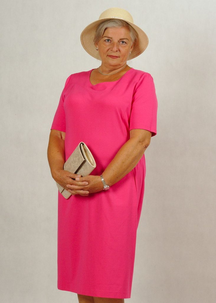 Prosty fason jest ponadczasowy, długość sukienki sięga lekko za kolano.