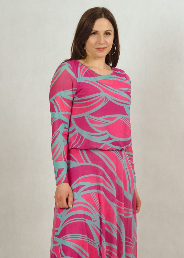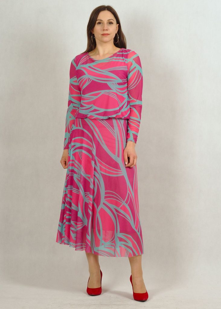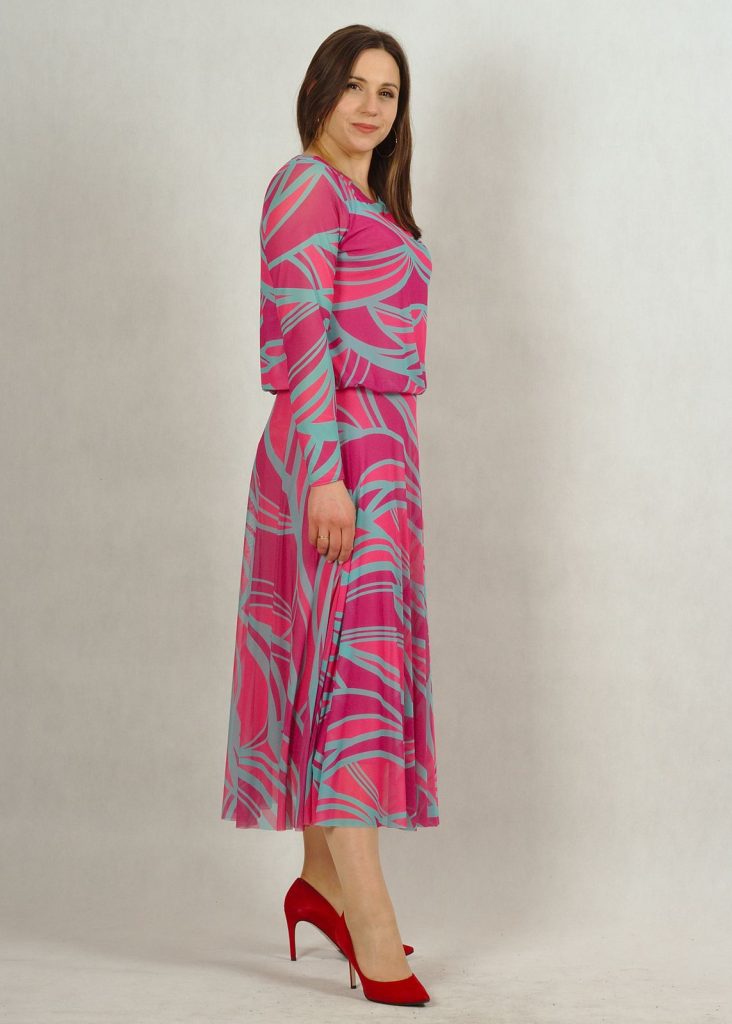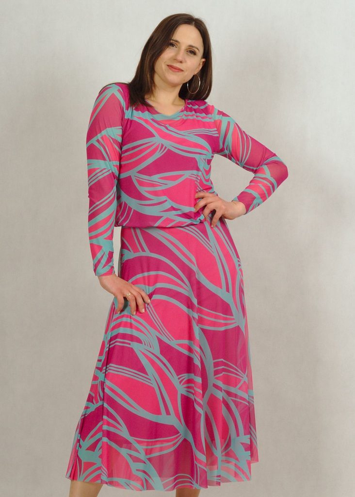 Kolorystyka sukienki jest wyjątkowa. Kolor bazowy – róż, a na nim różne subtelne geometryczne wzory w kolorze turkusu*.