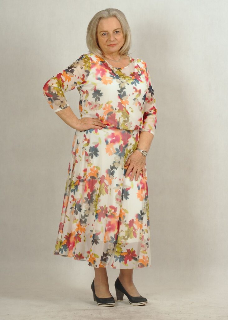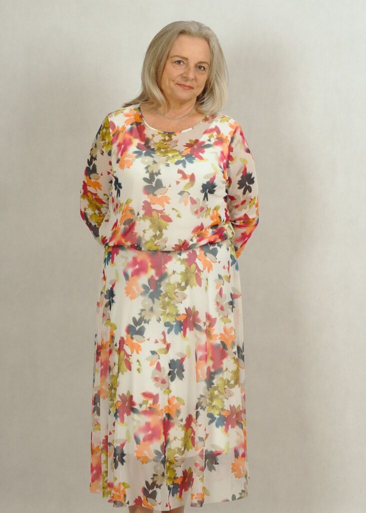Elegancka sukienka ecru z siatki w kolorowe kwiaty /620/