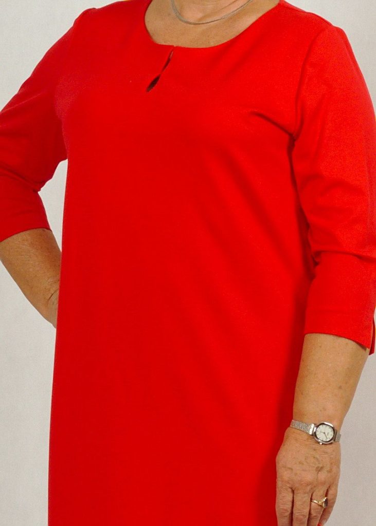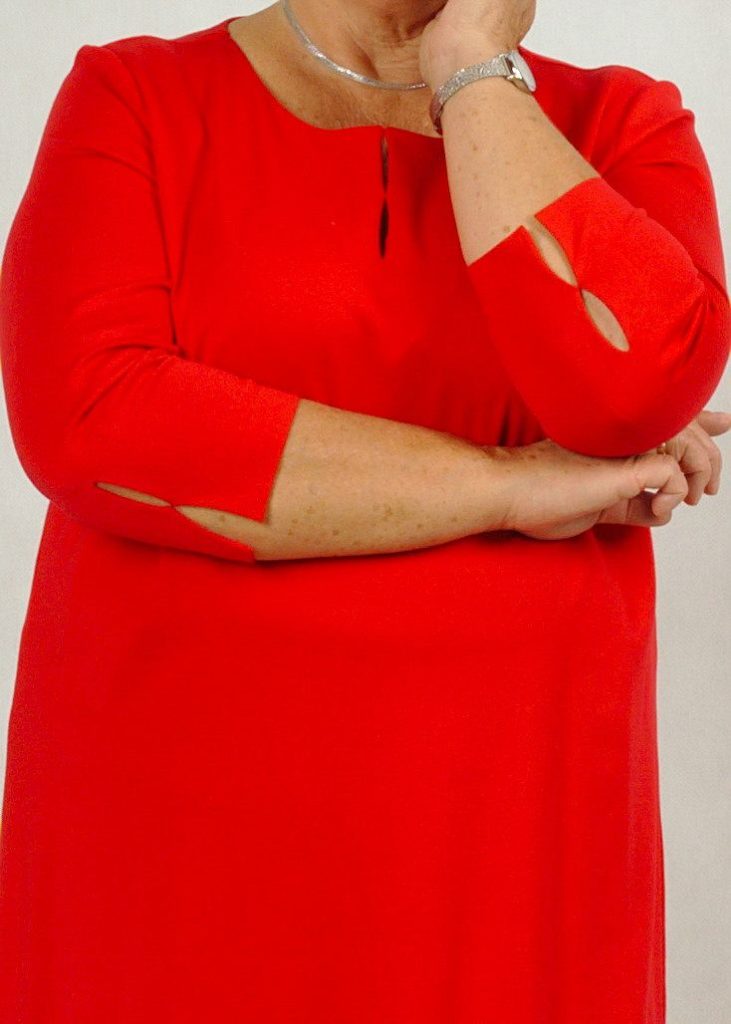 Elegancka sukienka jednokolorowa czerwona, z interesującymi rozcięciami przy dekolcie i przy rękawie.