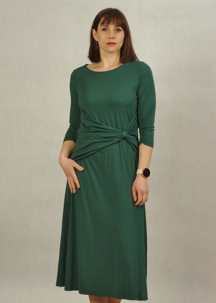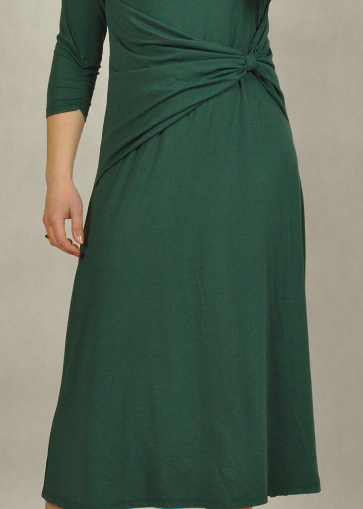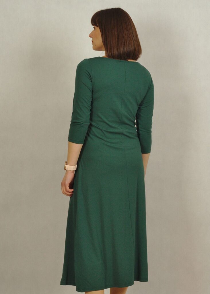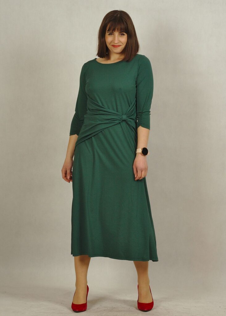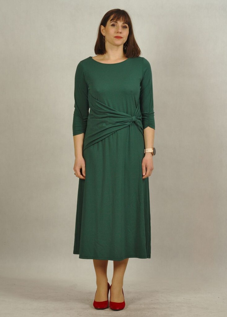 Sukienka z rękawem 3/4 oraz marszczeniem – to świetny detal, który robi robotę.