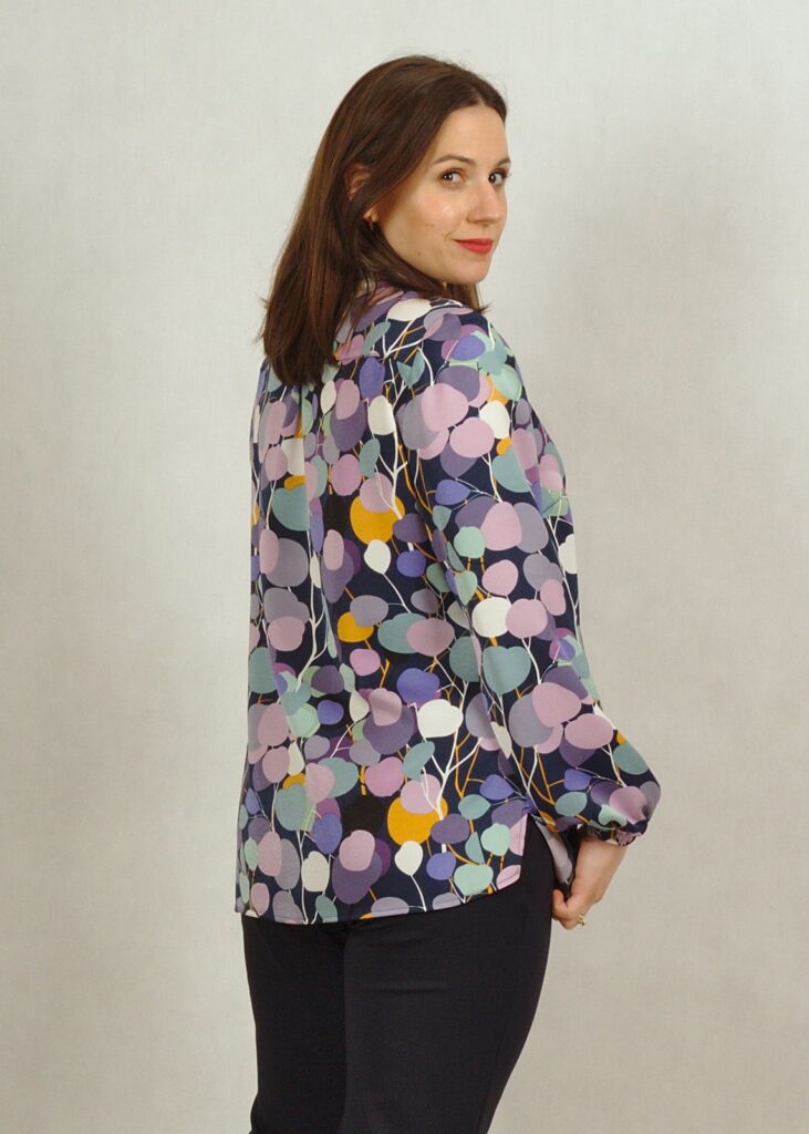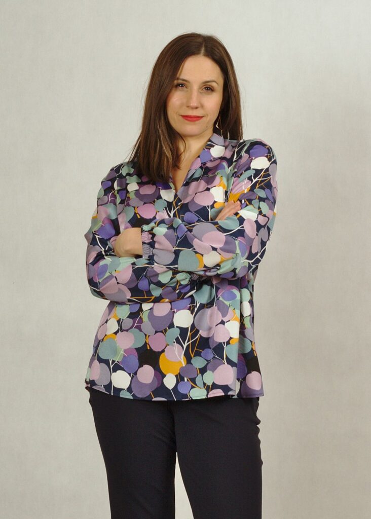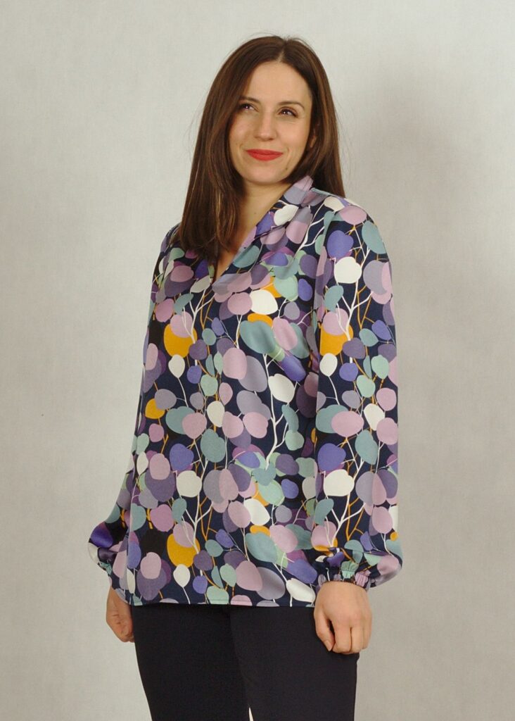 Stanowi bardzo elegancką wersję bluzki z postawionym kołnierzykiem – to bardzo charakterystyczny element, przykłuje uwagę.