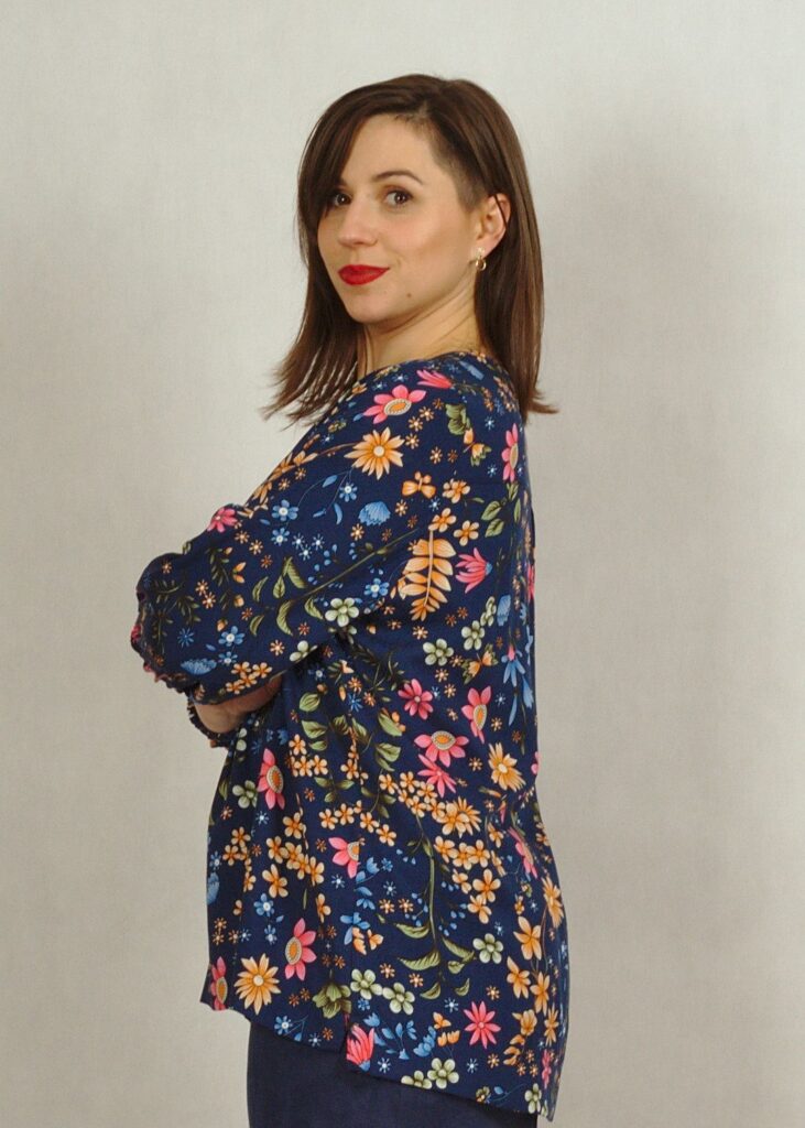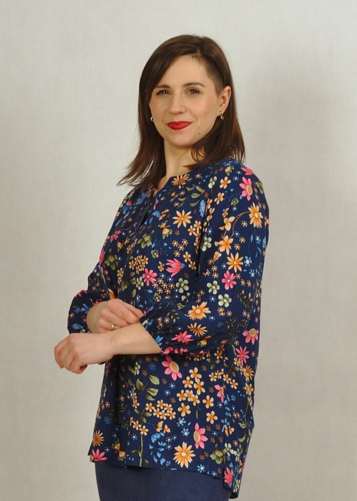 Bluzka ma dopracowany dekolt z obszytym rewersem, który pięknie się prezentuje!