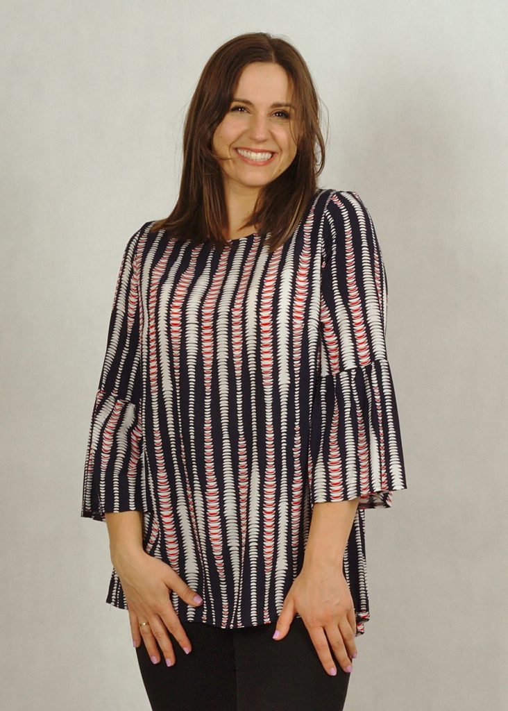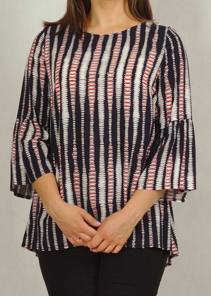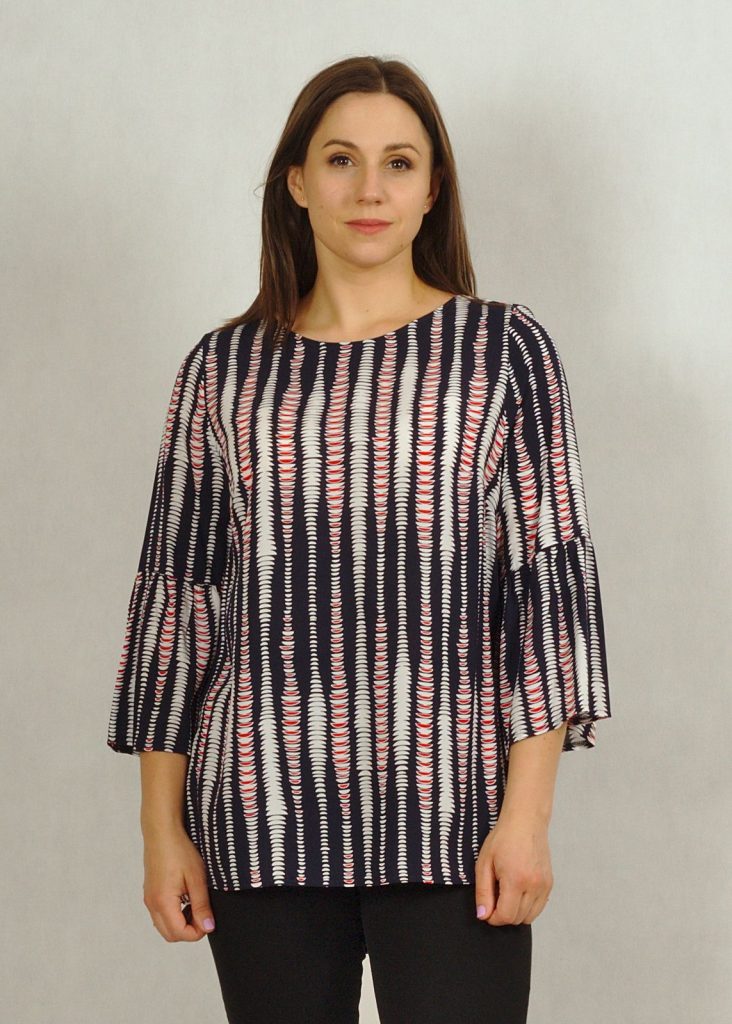 Połączenie bieli, granatu z dodatkiem czerwieni dodaje bluzce elegancji.