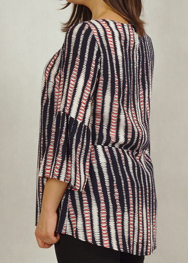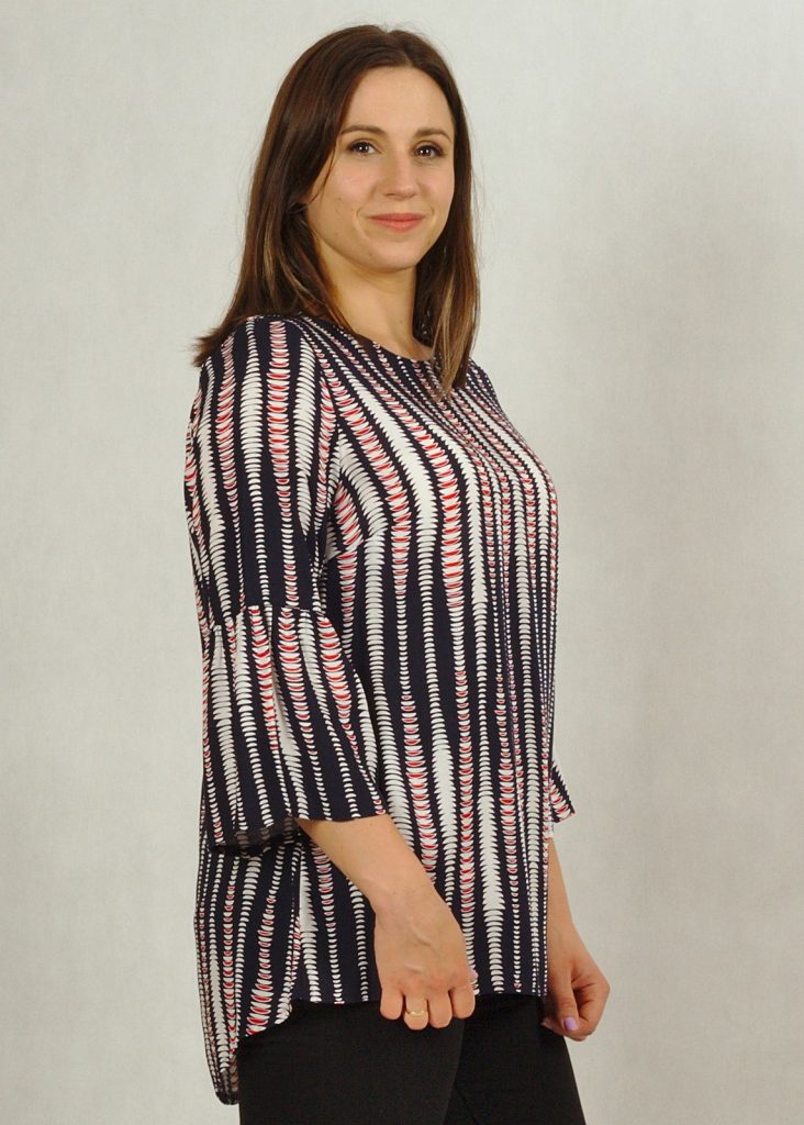 Bluzka z tyłu posiada charakterystyczne odcięcie i jest lekko przedłużona.