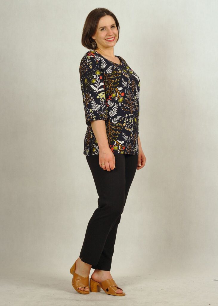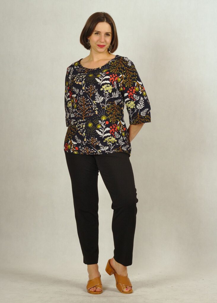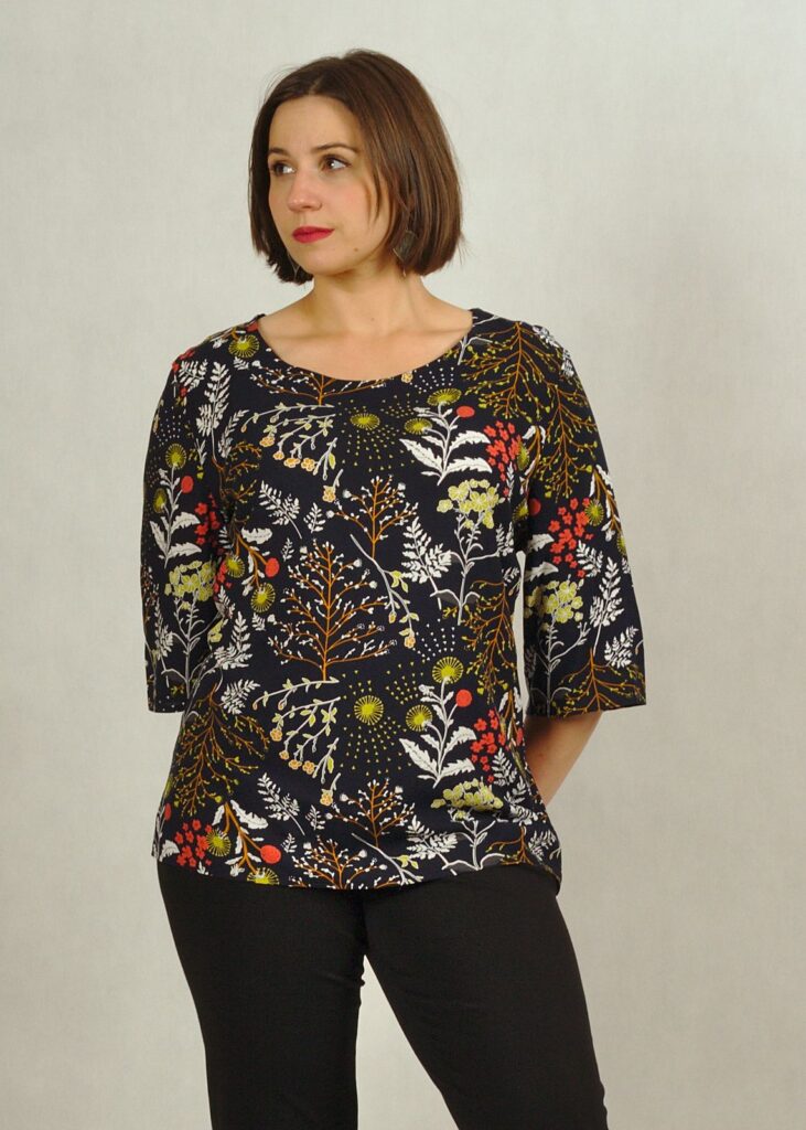 Bluzka ma rękaw do łokcia i prosty fason, również jej dół jest prosty.